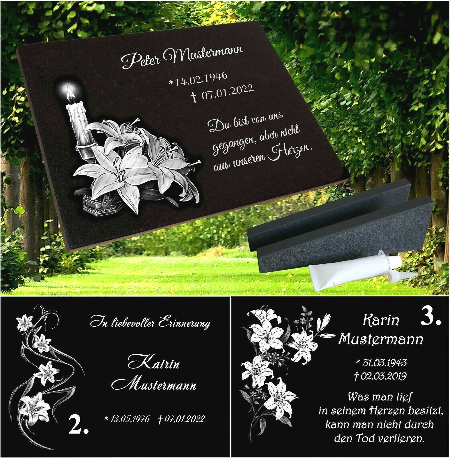 Beschreibung Dieses Angebot bezieht sich auf eine Granitplatte(Größe nach Auswahl ) mit gravierter Inschrift, Motiv und mit oder ohne Stütze. Diese kann nach Wunsch gestaltet werden. Die Oberfläche der Grabplatte ist poliert und die Kanten sind geschliffen. Die Stütze( zweiteilig, Granito) wird aus