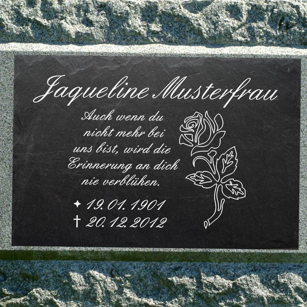 Grabstein Schiefer Stein Grab Tafel mit Rose-001 @ MIT IHREM TEXT @ 30 x 20 cm