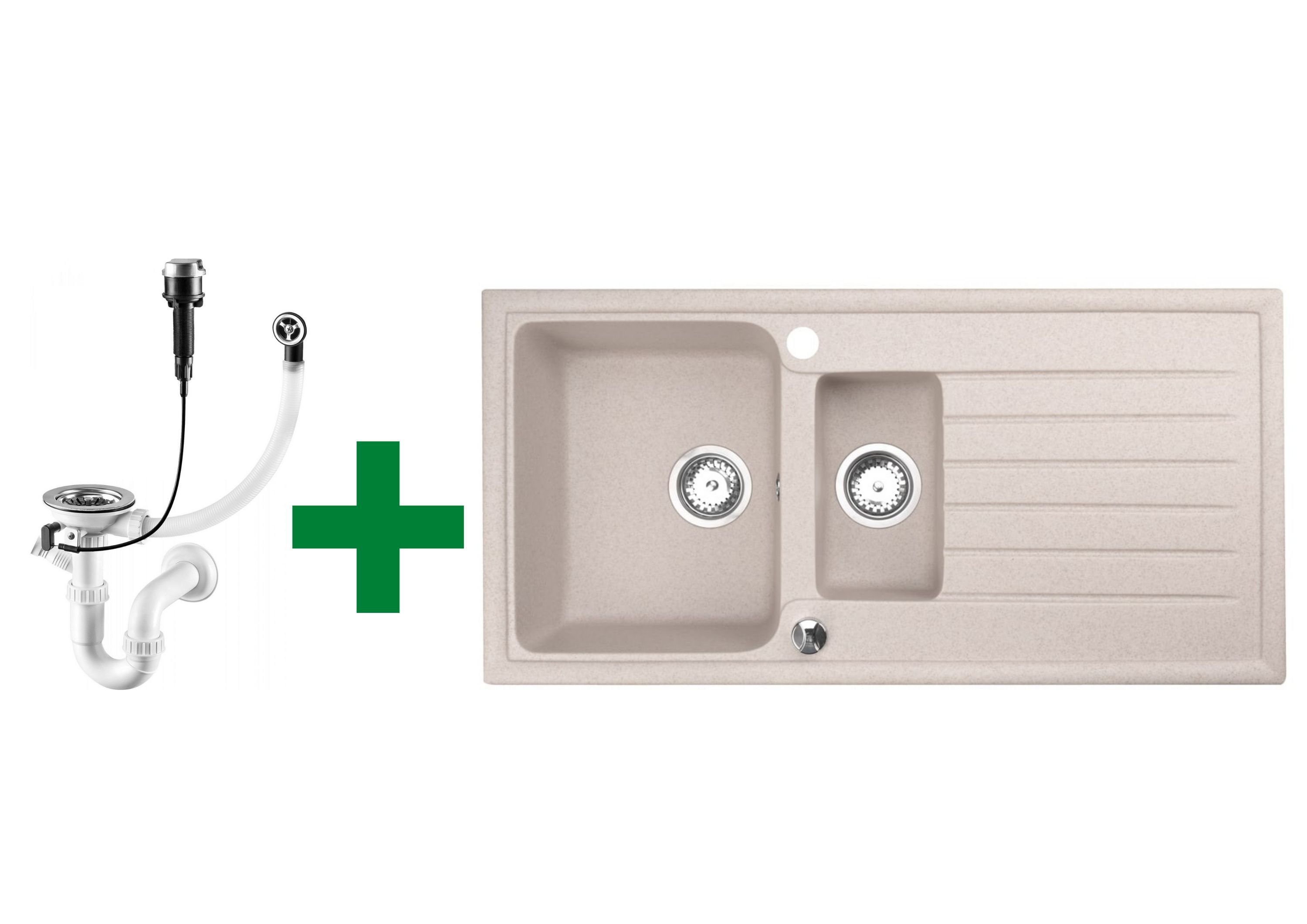 Granitspüle 100x50 cm mit Abtropffläche inklusive Zubehör-Set Beige