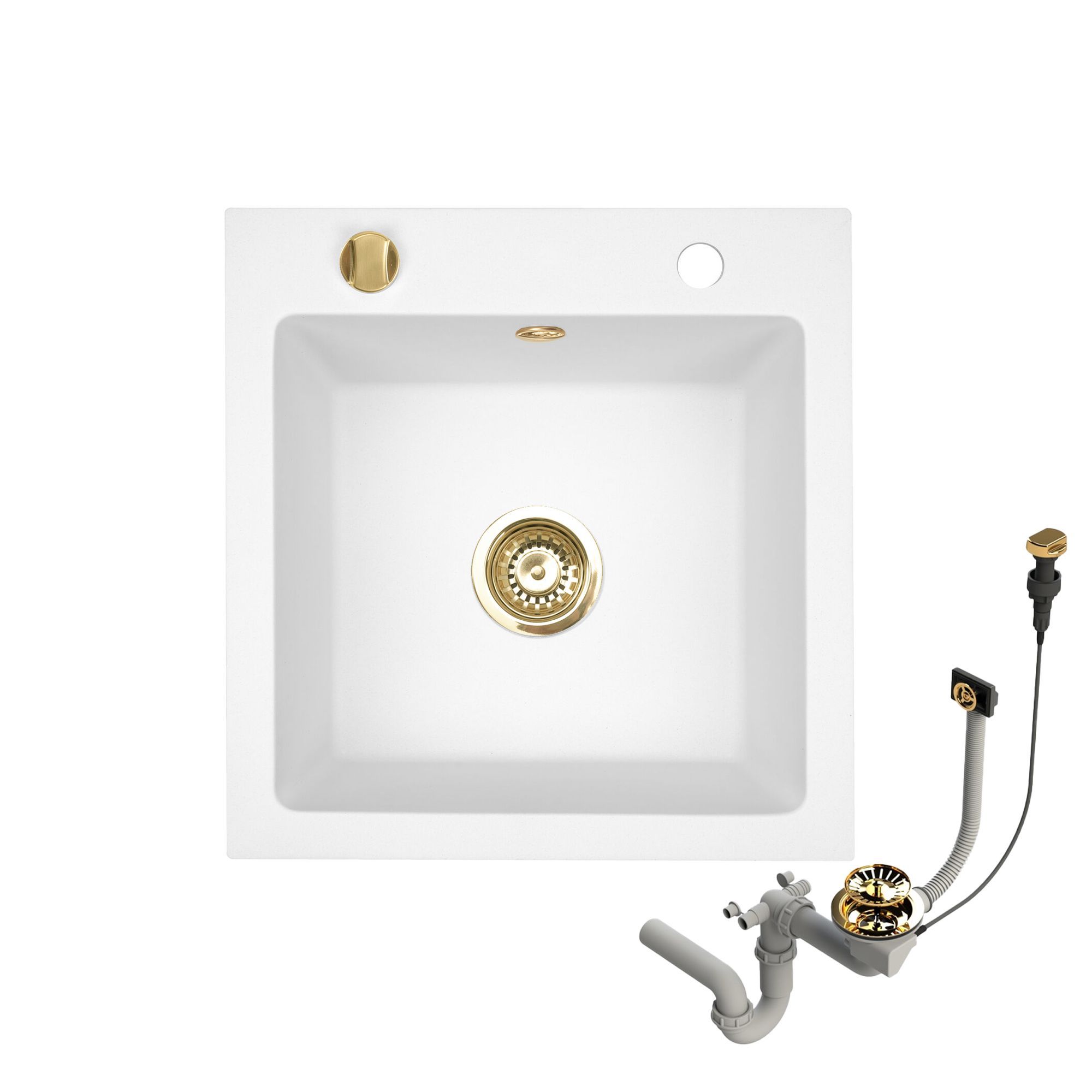 Granitspüle 48x50 Weiß + Siphon Set + Gold Armatur