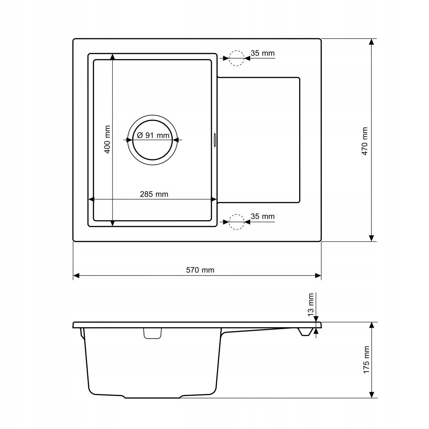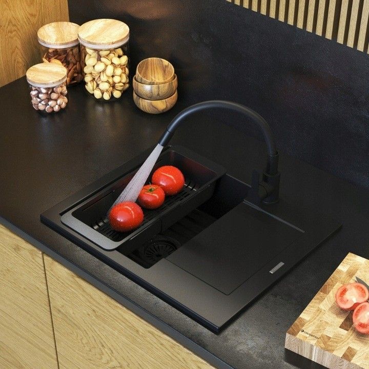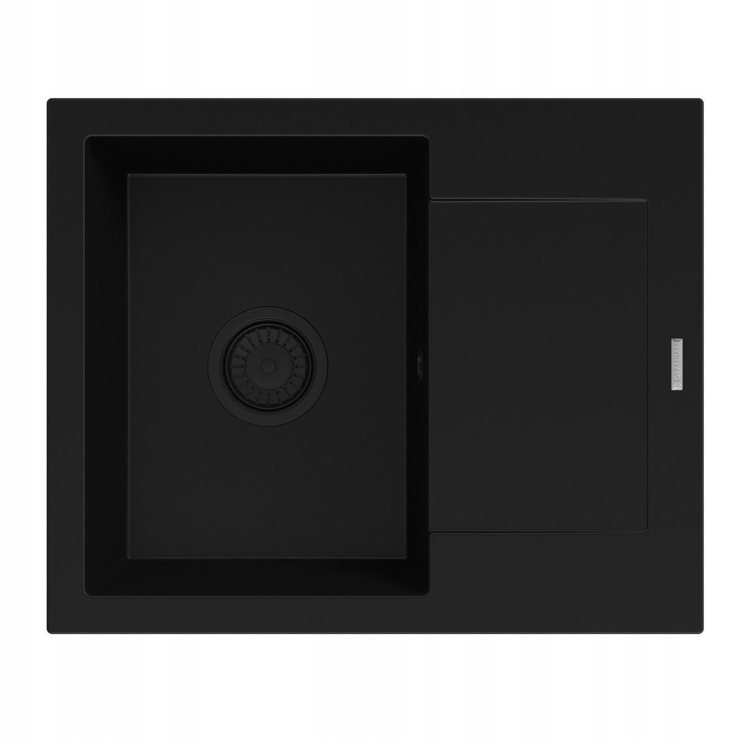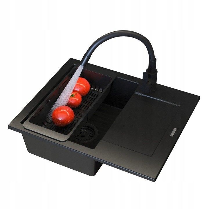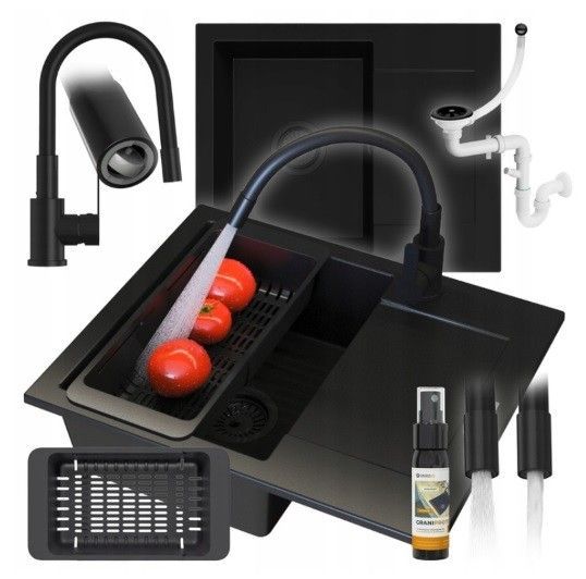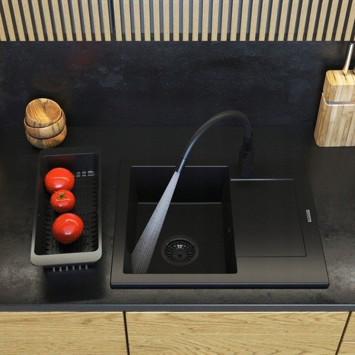 Granitspüle BELLO 57x47, 1 Becken Abtropffläche Set flexibel Armatur Siphon Schwarz