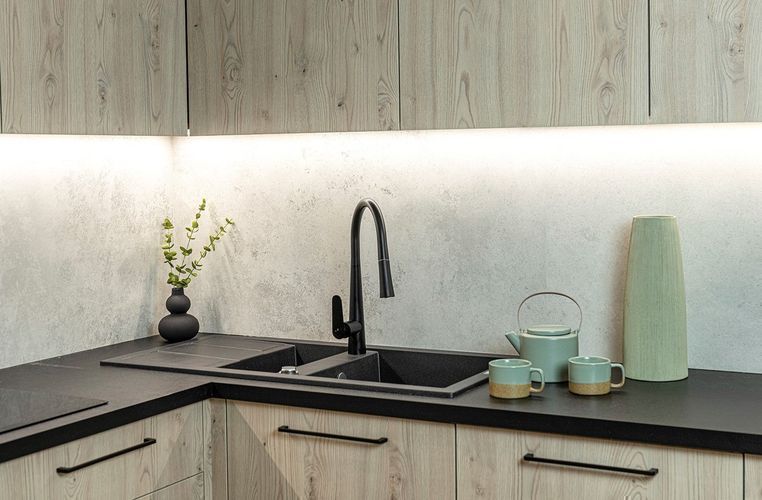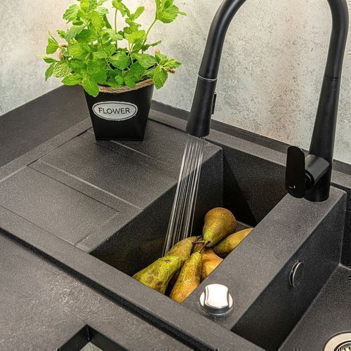 Granitspüle Doppelbecken Barbados 48x100 Schwarz mit Abtropffläche | Siphon im SET!