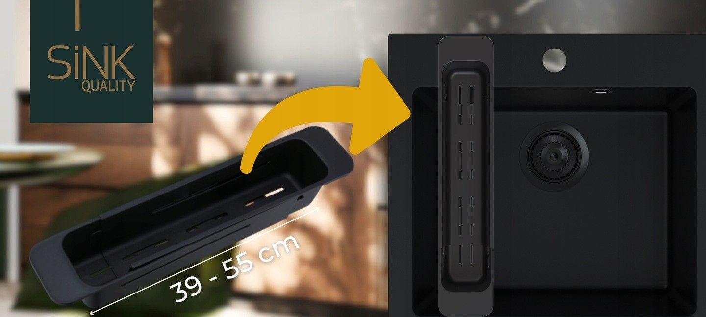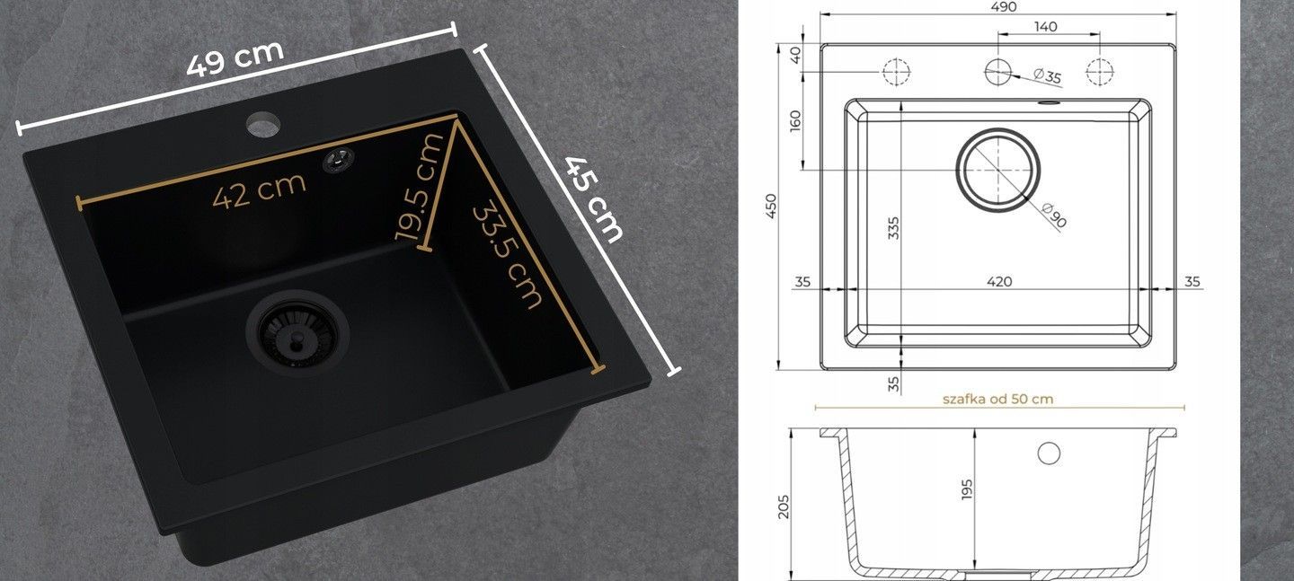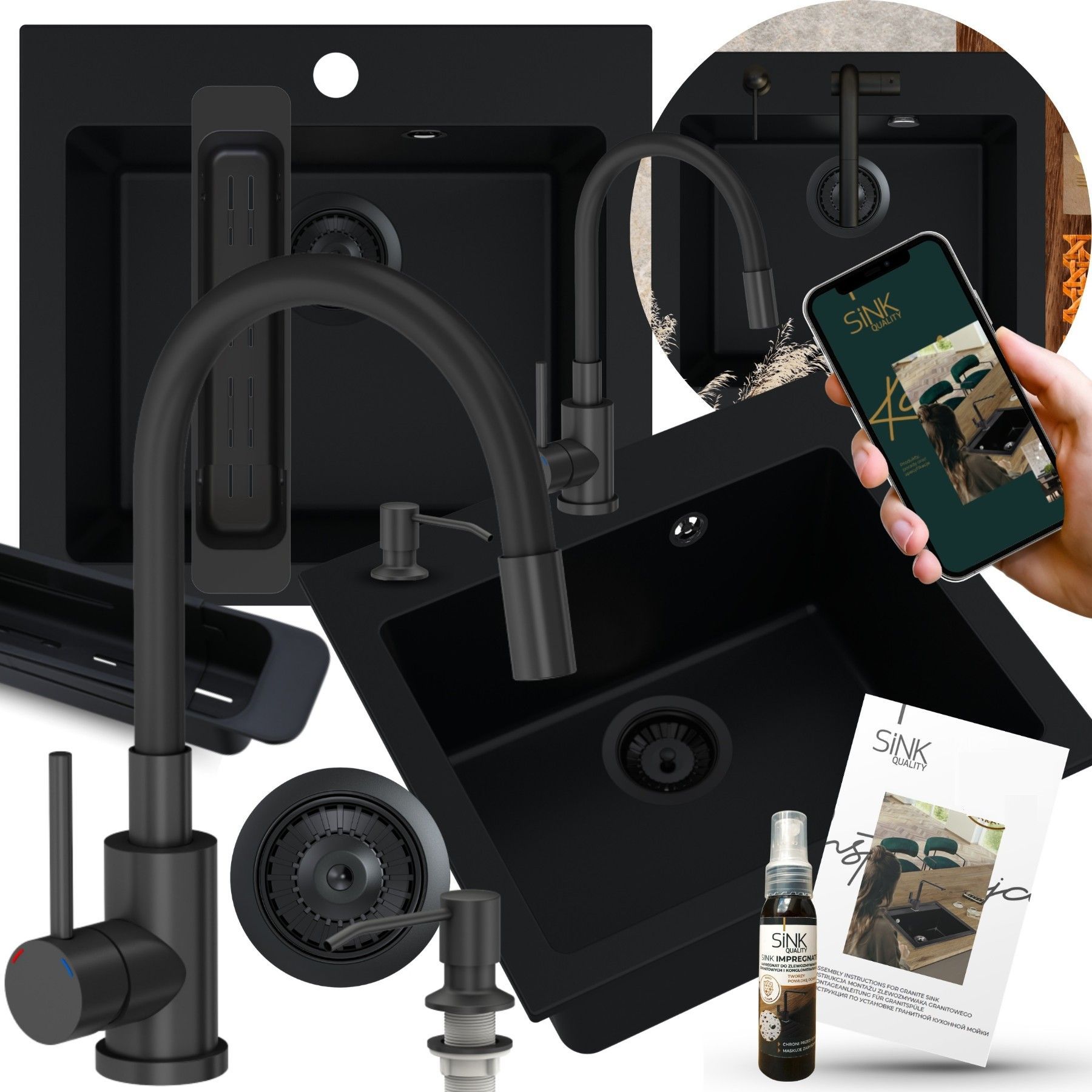 Granitspüle Schwarz FERRUM 49x45cm, SET 7 in 1, Armatur Siphon
