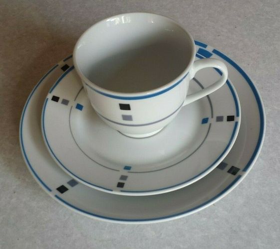 Graphia Blue 3 teiliges Gedeck Flirt by R&B Ritzenhoff & Breker Porzellan Tasse: Ø8,5cm Untertasse: Ø15,5cm Teller: Ø19cm spülmaschinengeeignet Bei Interesse kann der Käufer bis zu 3 weitere gleiche Gedecke zum jeweils gleichen Preis hinzu erwerben. Außerdem besteht die