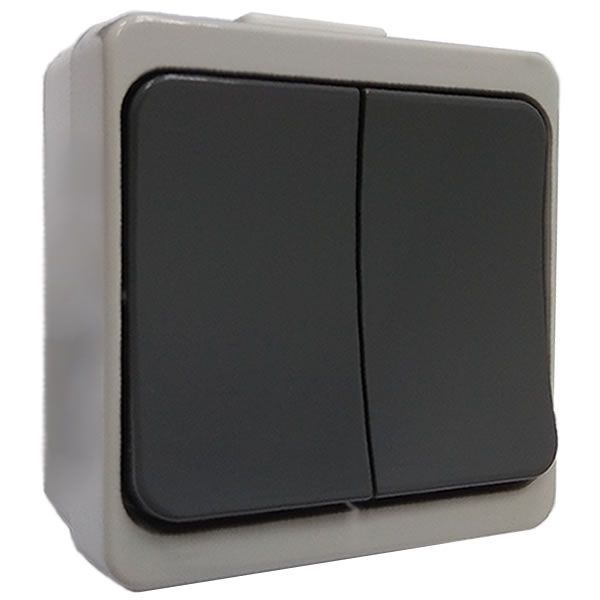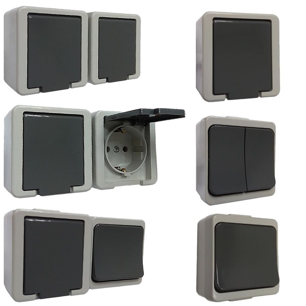 Grau Aufputz Doppelschalter Ein- Aus Schalter Steckdose IP44 Feuchtraum Schuko