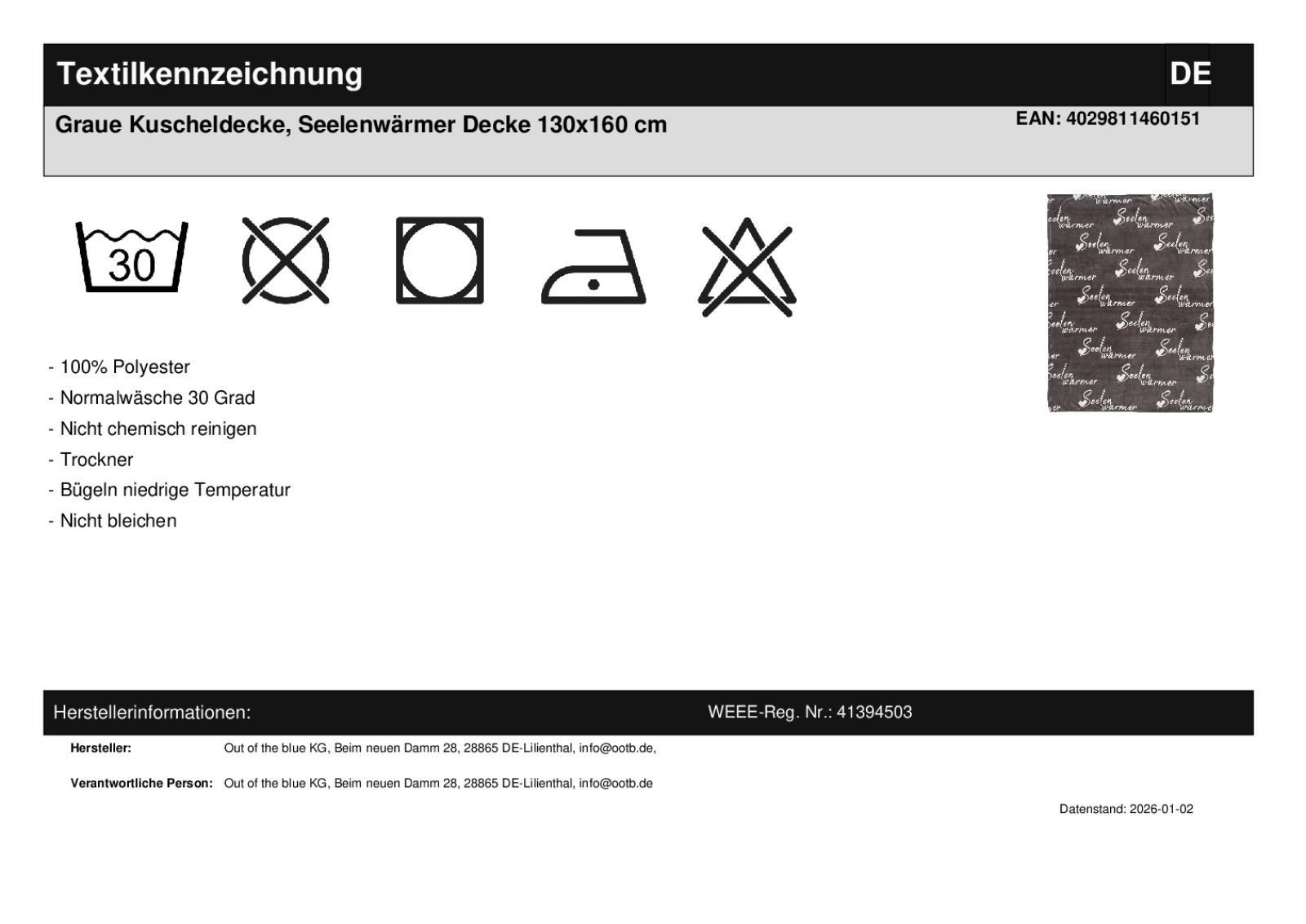 Out of the Blue Graue Kuscheldecke Seelenwärmer Wohndecke 130 x 160 cm Decke zum Kuscheln grau