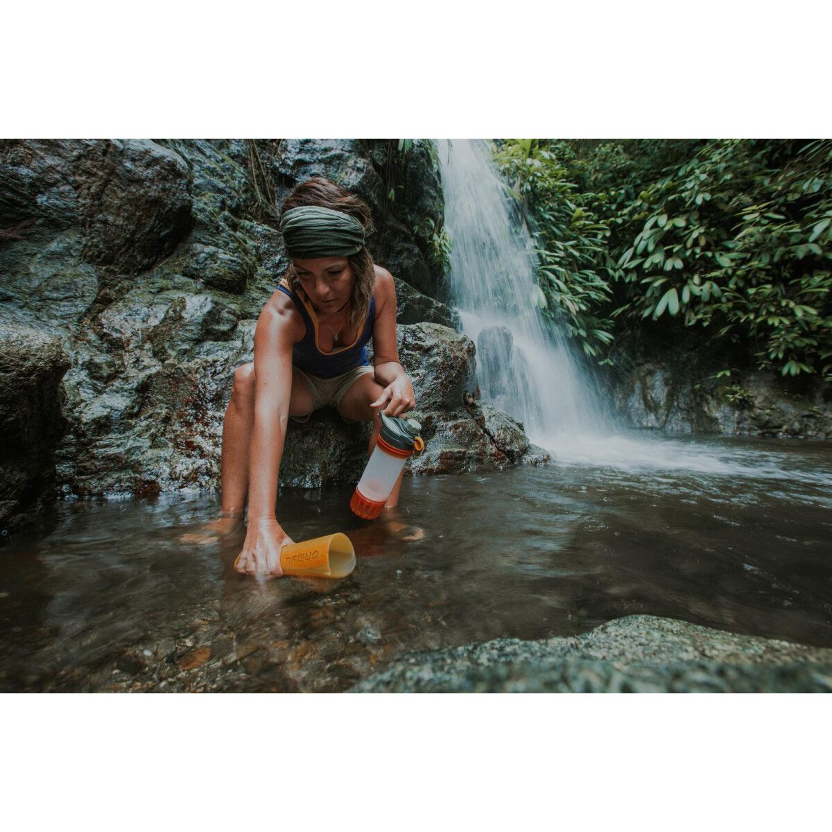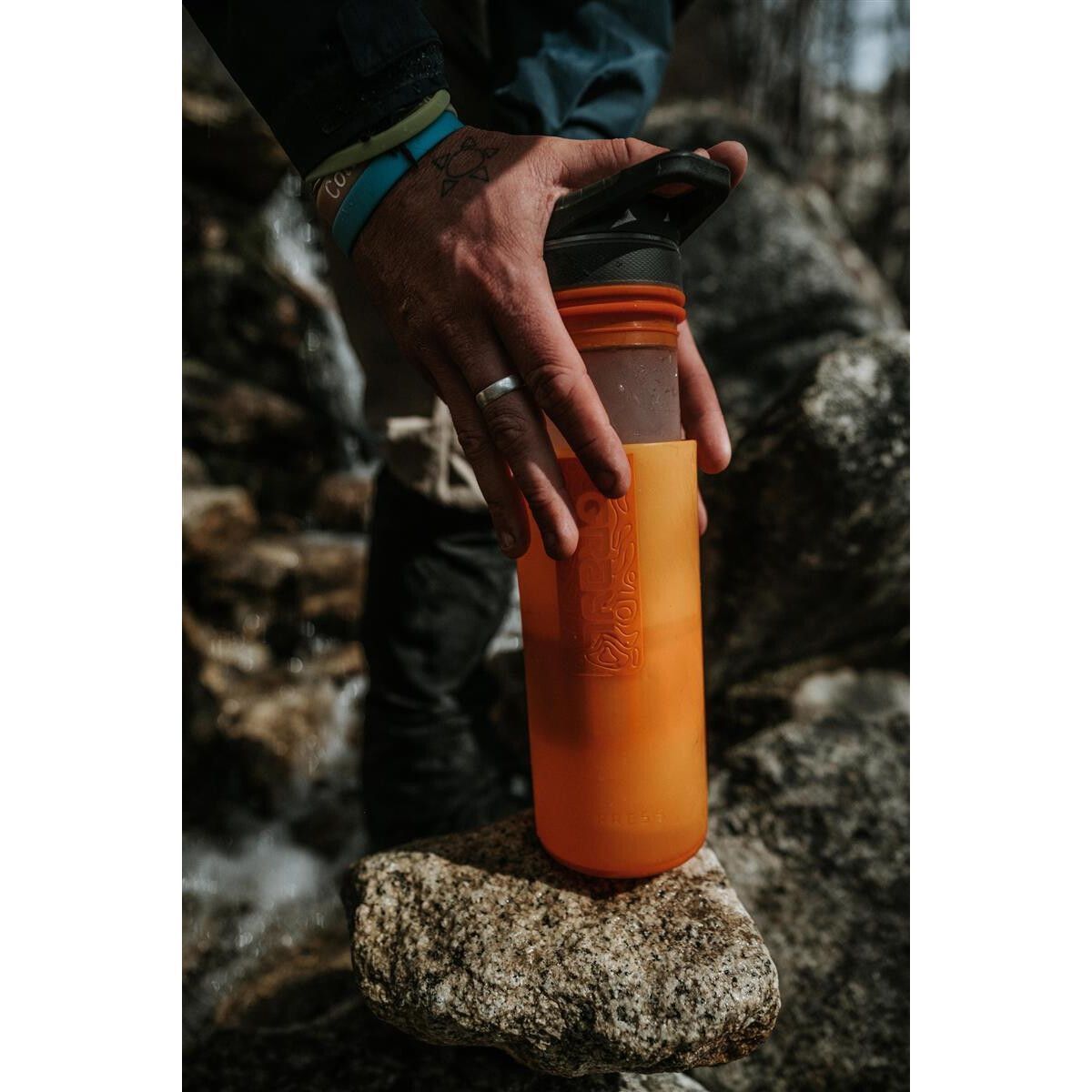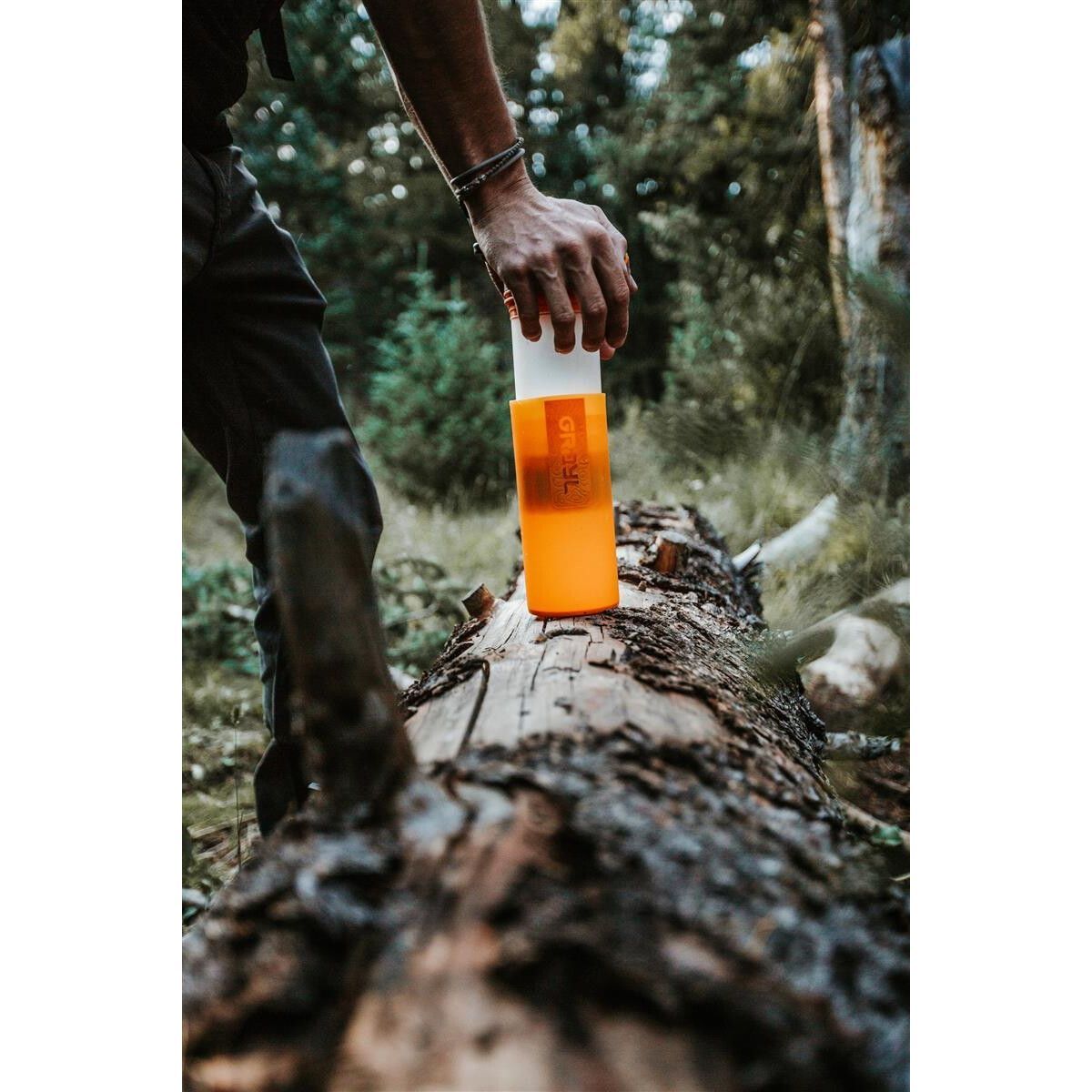 • Nur mit Süßwasser (keine andere Flüssigkeit) pressen. Kein Salz- oder Brackwasser. Setze die Innenpresse nicht unbehandeltem Wasser aus bzw. fülle sie nicht mit unbehandeltem Wasser, da es zu Kreuzkontaminationen kommen kann. Tannine sind natürliche organische Verbindungen, die aus verrottenden Vegetationen und Bäumen austreten und zur Verstopfung von Patronen führen können. Verwende keinen Grayl in Wasser mit hohem Tassin-Gehalt. Patronen werden nach einem Einfrier-/Auftauzyklus nicht wesentlich beeinträchtigt. Verwende die Kartusche nach 3 oder mehr Einfrier-/Auftauzyklen nicht mehr.