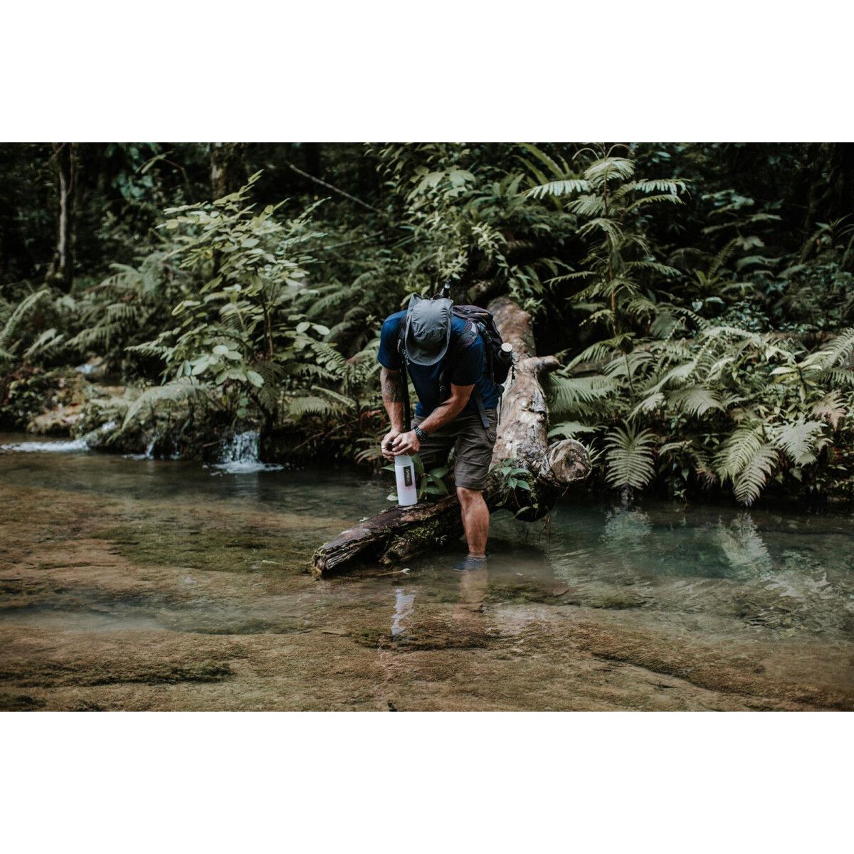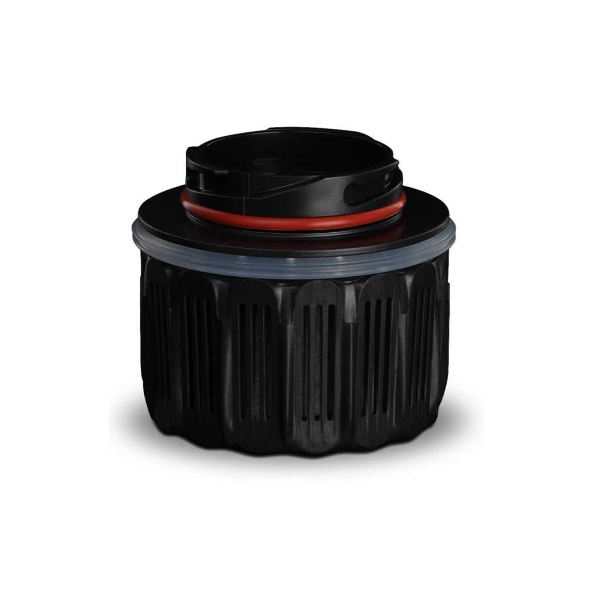 • Nur mit Süßwasser (keine andere Flüssigkeit) pressen. Kein Salz- oder Brackwasser. Setze die Innenpresse nicht unbehandeltem Wasser aus bzw. fülle sie nicht mit unbehandeltem Wasser, da es zu Kreuzkontaminationen kommen kann. Tannine sind natürliche organische Verbindungen, die aus verrottenden Vegetationen und Bäumen austreten und zur Verstopfung von Patronen führen können. Verwende keinen Grayl in Wasser mit hohem Tassin-Gehalt. Patronen werden nach einem Einfrier-/Auftauzyklus nicht wesentlich beeinträchtigt. Verwende die Kartusche nach 3 oder mehr Einfrier-/Auftauzyklen nicht mehr.