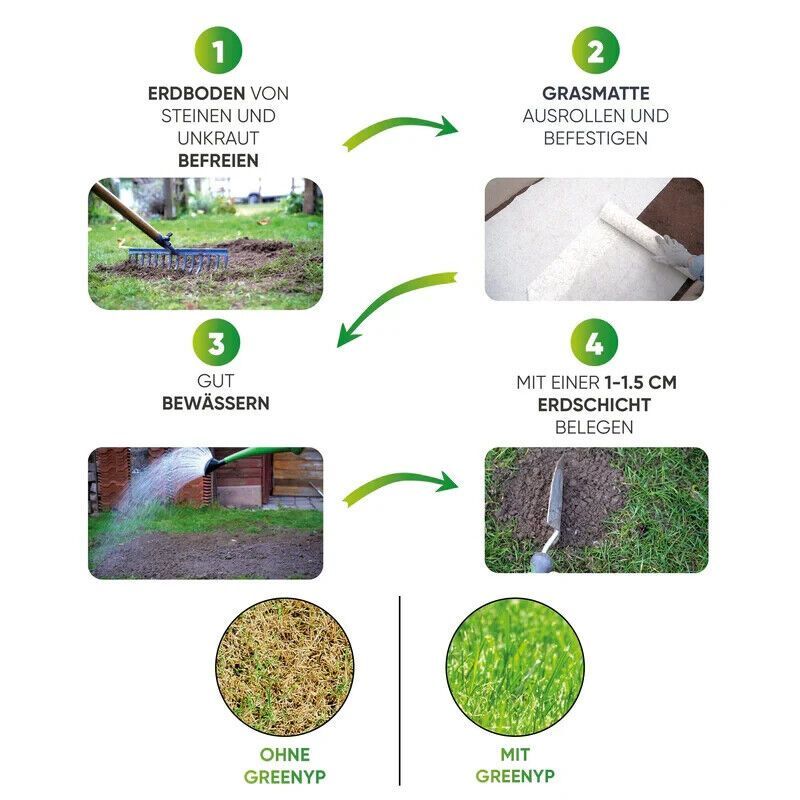 Greenyp All-In-One Rollrasen 100m² = 5x 0,5m x 40m All-In-One Rasenmatte mit integrierten Rasensamen - ausrollen, wässern, fertig! Absorbiert 10x mehr Wasser Kein Vogelfraß oder Wegspülen der Saat Optimale Saatverteilung Die Alternative zum Rollrasen Haben Sie kahle Stellen in Ihrem GartenEuro Oder