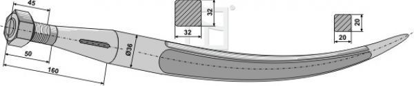 Greiferzinken 800 gebogen mit konischer Mutter Profil: Vierkant 32 32 Technische Datem: Gebogener Zinken mit Konischer Mutter Bestell.-Nr.: 18867 Gewicht: 3.520 kg Form: gebogen Profil: Vierkant 32 32 mm Gewinde: M 20 x 1.5 mm Radius: 780 mm Länge : 800 Gewindelänge: 45 mm Schaftlänge gesamt 160 mm
