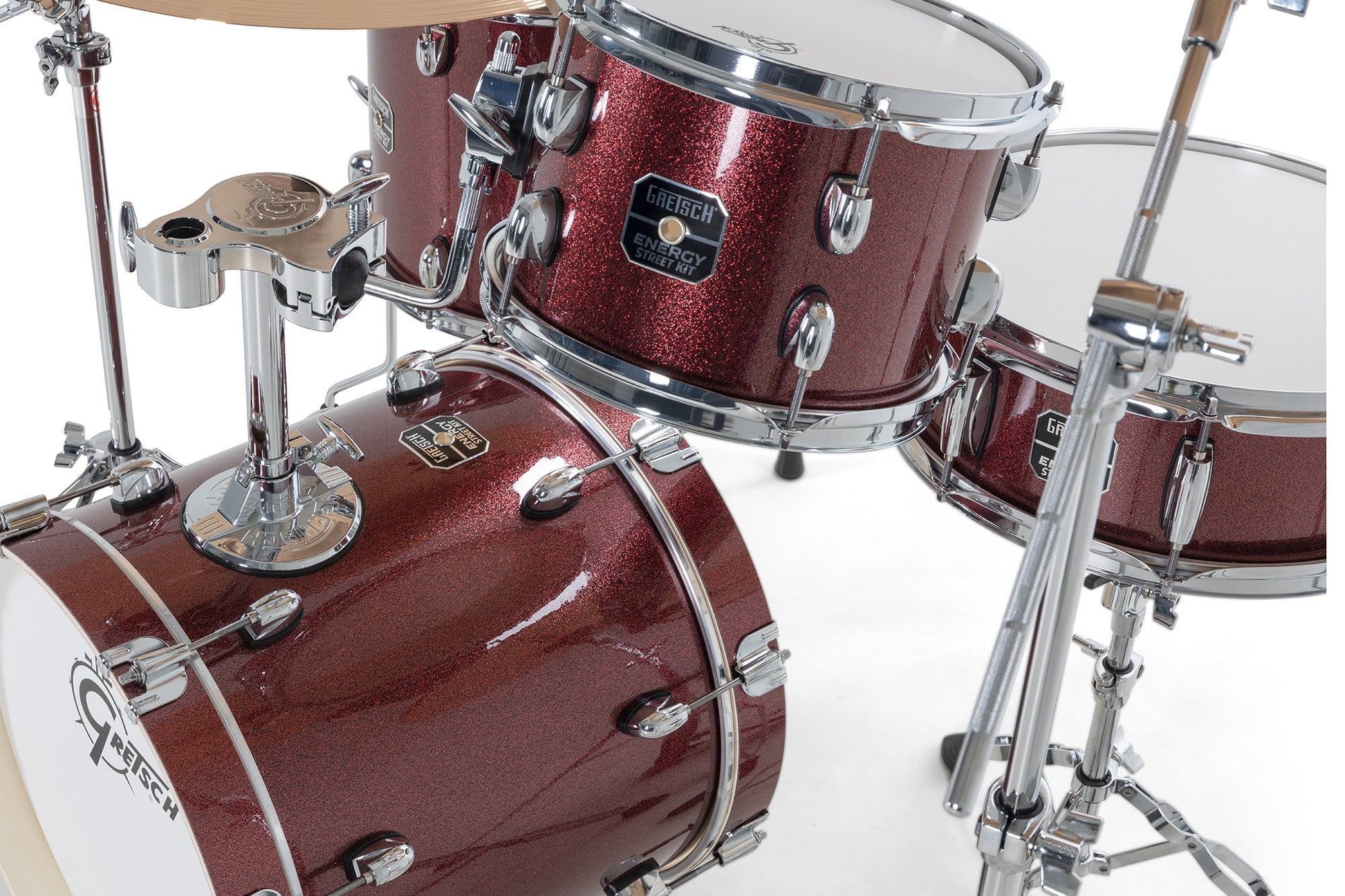 Gretsch Energy Kesselsatz Street Kit - Ruby Sparkle Die Gretch Energy-Serie bietet die perfekten Einsteigerinstrumente für die nächste Generation. Die Featrures: Energy Serie Street Kit Kessel aus 7-lagigem Pappelholz foliert 30° Kesselgratung 1,6 mm Stahlspannreifen Chrome Hardware Farbe: Ruby Spar