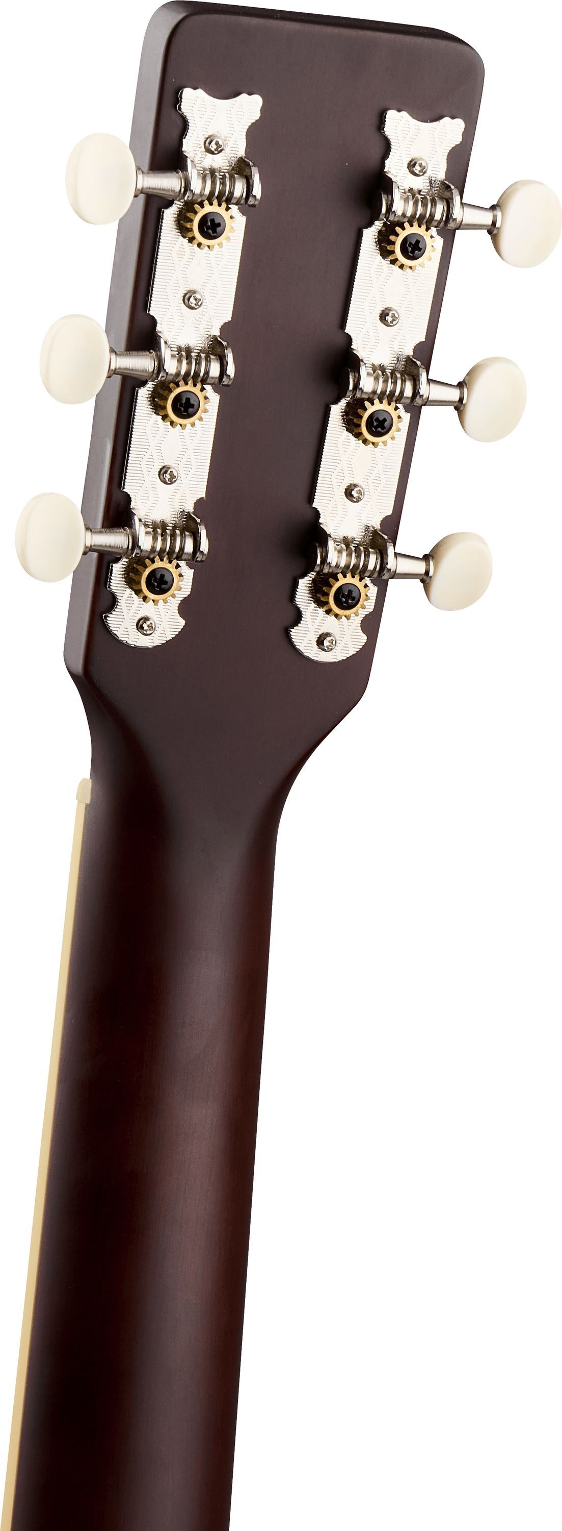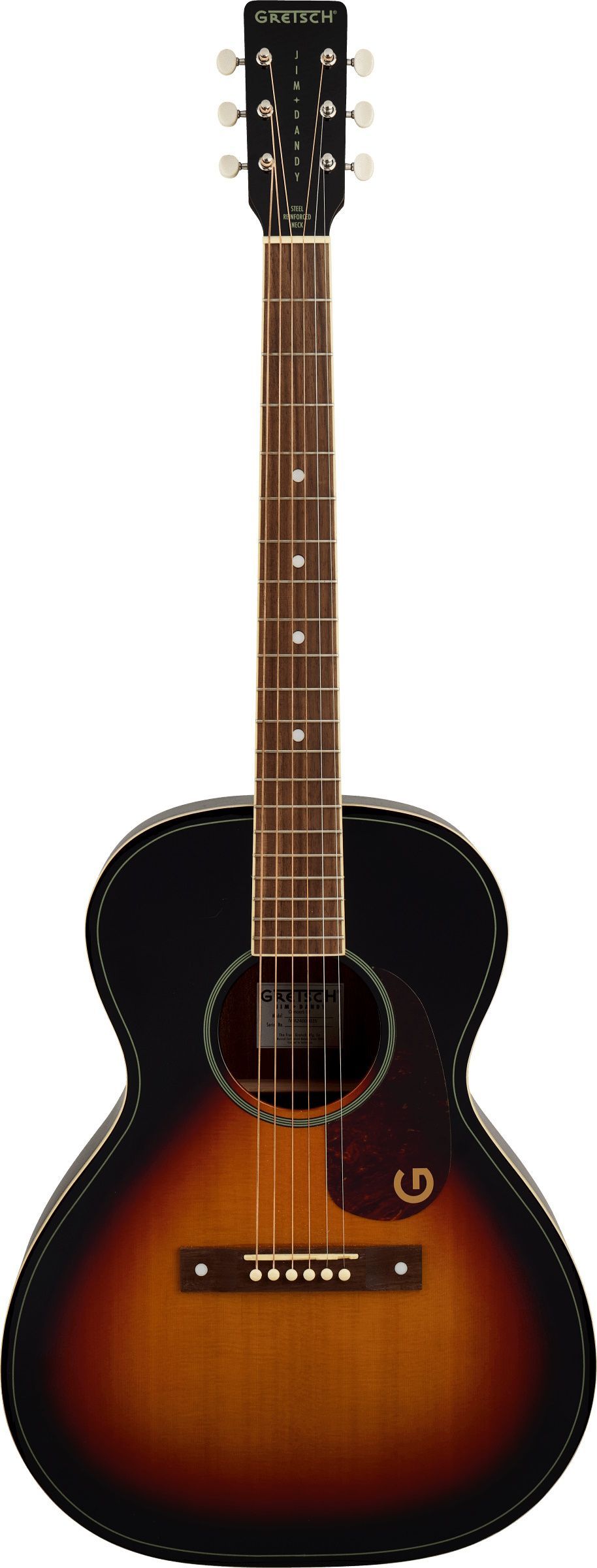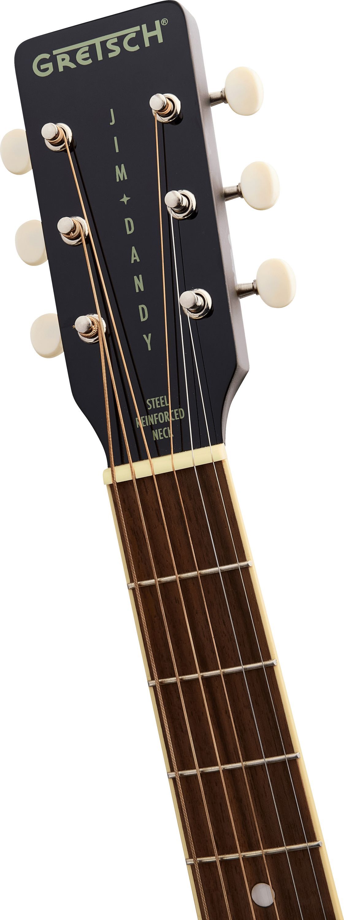 Gretsch Jim Dandy Concert Solid Top Bauform: Concert Decke: Fichte, massiv Boden und Zargen: Sapele Bracing: X-Bracing Hals: Nato Griffbrett: Walnuss Halsprofil: 'C' Mensur: 61 cm ( 24' ) Sattelbreite: 42,8 mm ( 1,69' ) Griffbrettradius: 12' 18 Vintage Bünde Sattel und Stegeinlage: Synthetischer Kno
