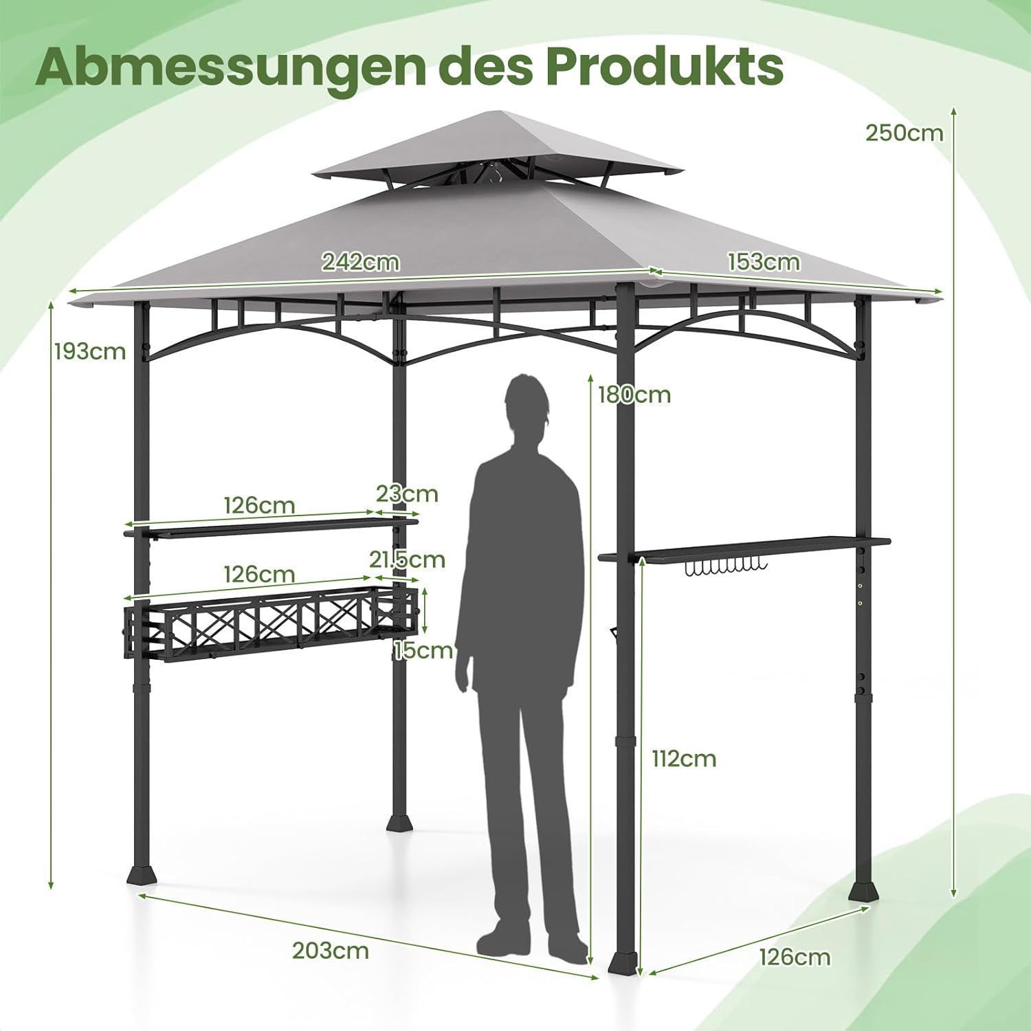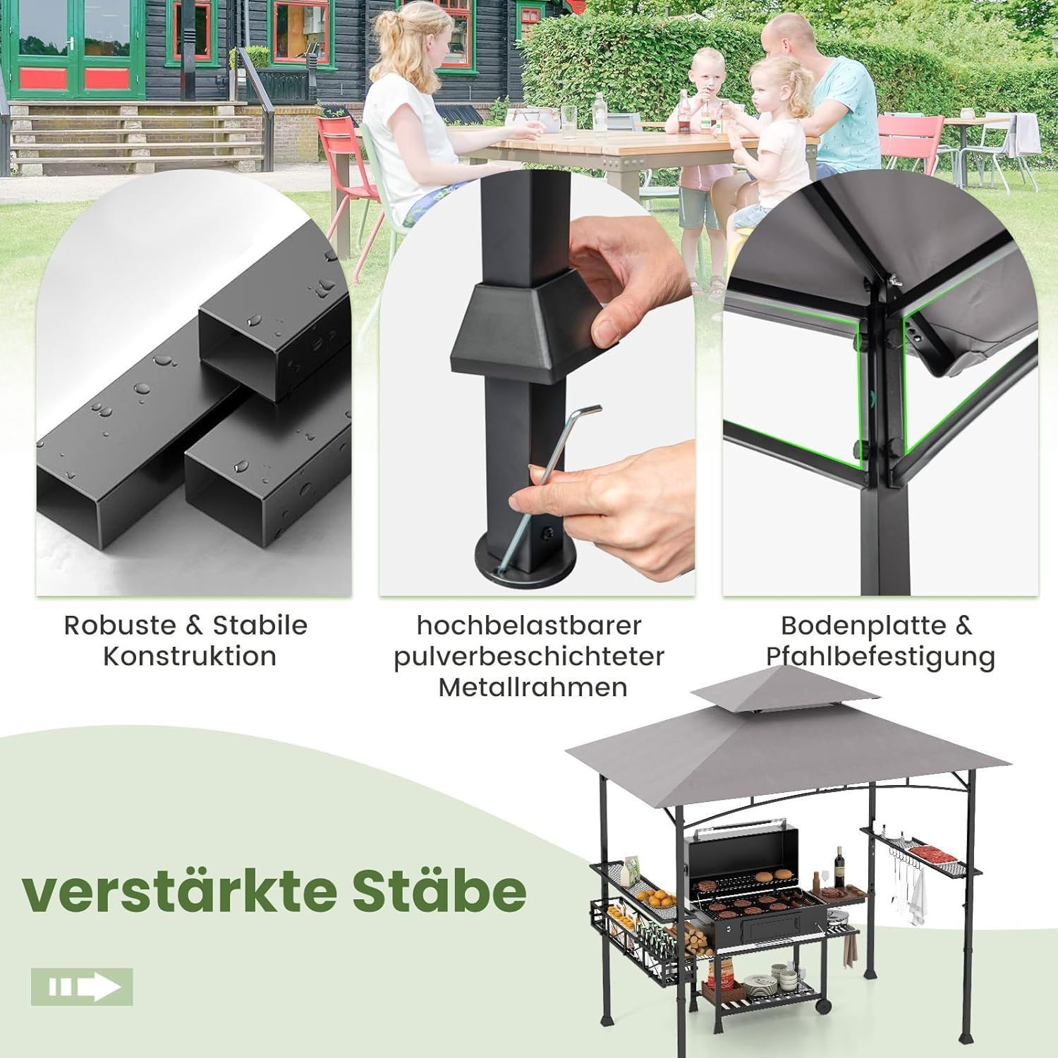 Grillpavillon mit Doppeldach, Seitenregalen, Metallkorb, Haken und Flaschenöffner