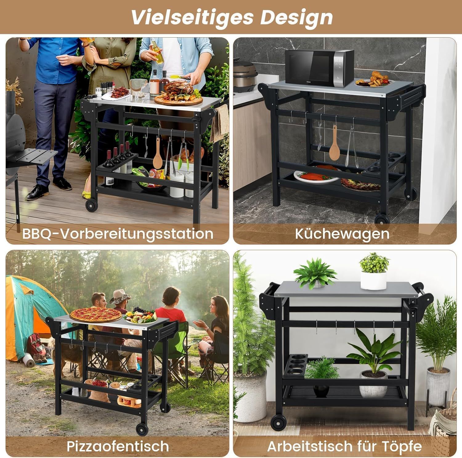 Grillwagen aus HDPE, Grilltisch mit Gew¨¹rztablett, Weinflaschenregal, Griff & 2 Roll