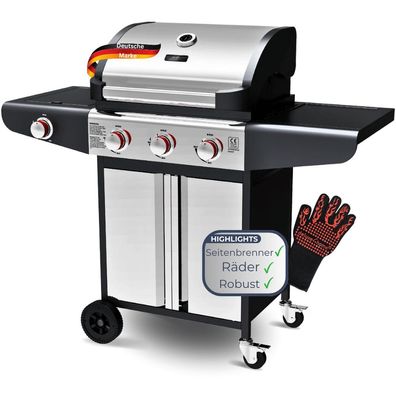 Gasgrill 3 + 1 Brenner Deckel DELO [Handschuhe] Grillwagen Seitenbrenner Campinggrill
