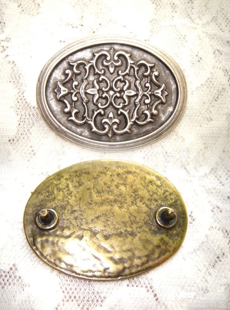 . Trachtenschmuck , Ledertasche , Ledergürtel sehr schöne Niete für Gürtel , Ledergürtel , Tasche und ähnliches ausgezeichnete Verarbeitung aus deutscher Herstellung massiv gearbeitet und 45 gr schwer , altsilberfarben wunderschöne reich verzierte ovale Form gesamt Breite ca 6,8 cm , Höhe 5,3 cm mit