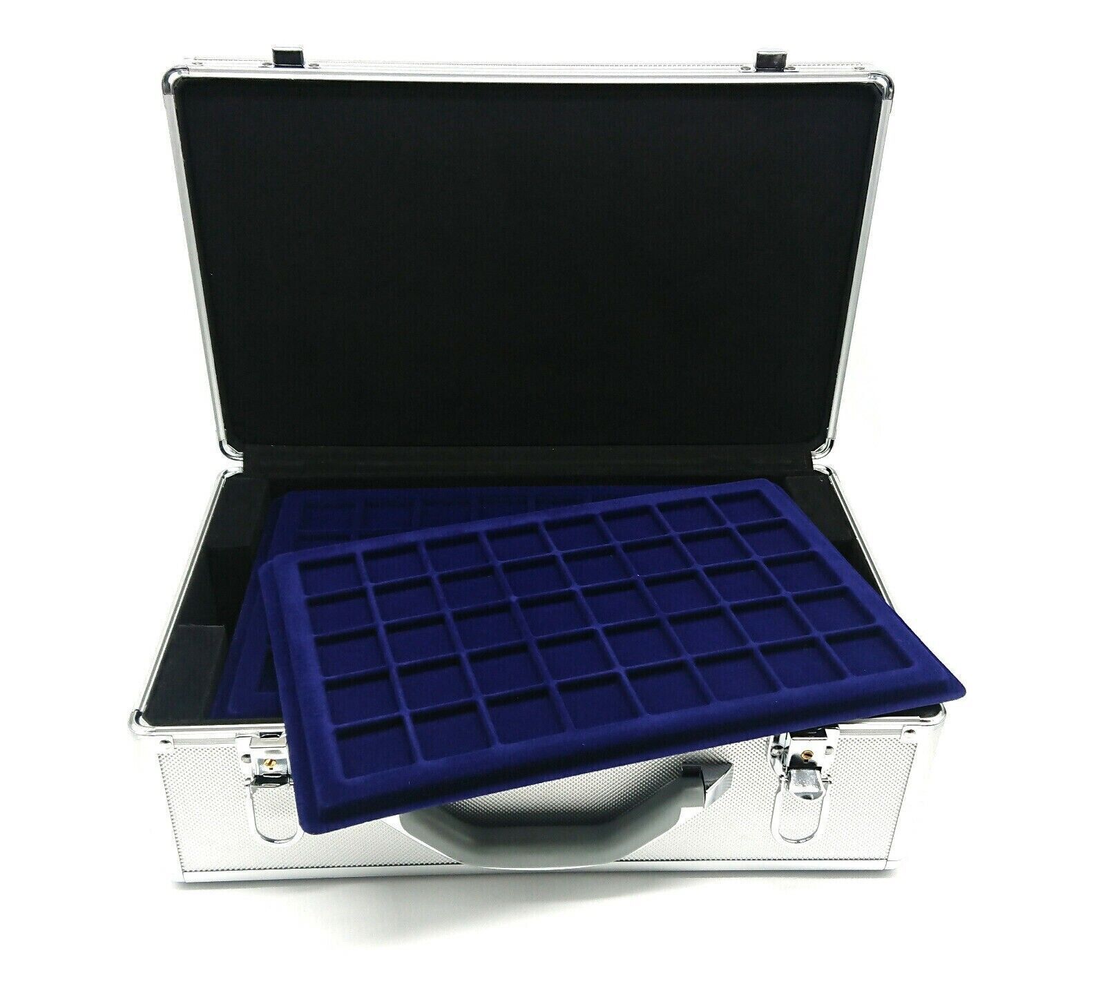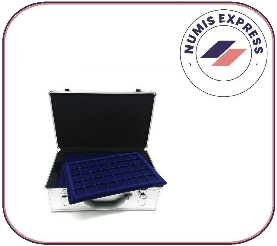 Großer Alu Aluminium Münzkoffer mit 12 blauen Tableaus für 480 Münzen bis 32mm