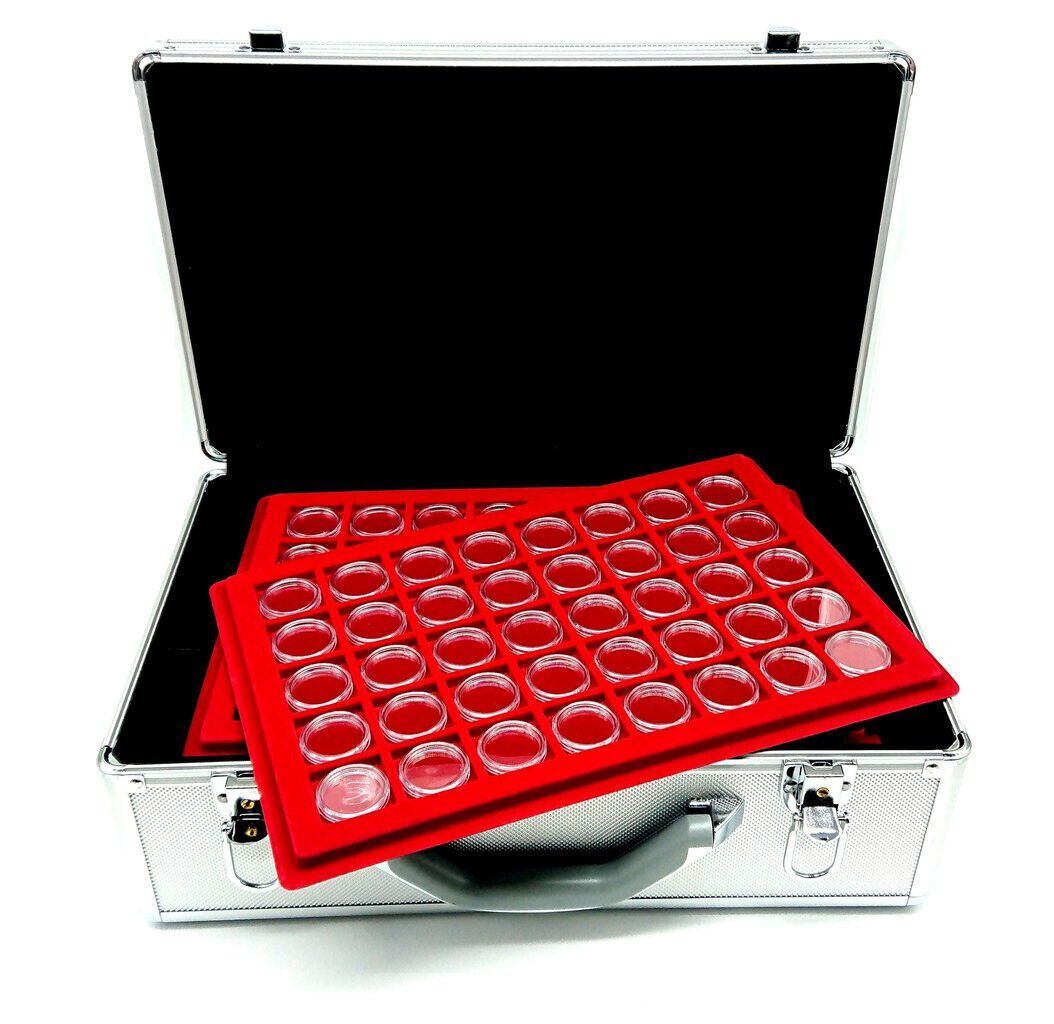 Großer Alu Aluminium Münzkoffer mit 12 roten Tableaus und 500 Kapseln 26mm