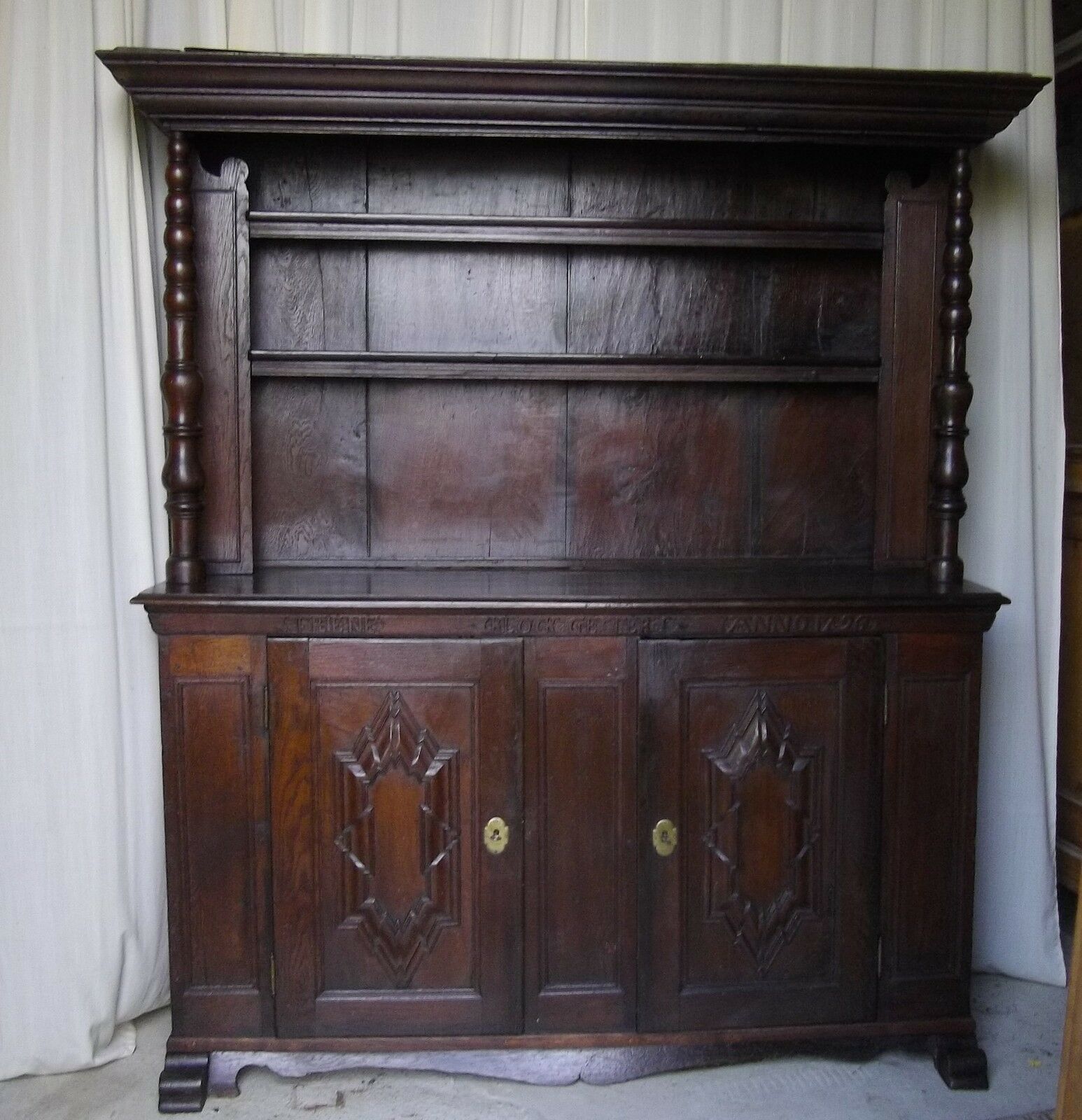 Geschirr-Schrank Küchen-Büffet von 1796 (Barock). Ober- und Unterteil. Material: Eiche dunkel. Inschrift: Triene Klock Geiter Anno 1796 . Sehr schöner Zustand! Maße: H 198, B 167 cm, T 56, Innentiefe 39 cm. Lieferung im Umkreis von 40 km frei Haus! Sonst Transport mit Spedition möglich (je nach Ange