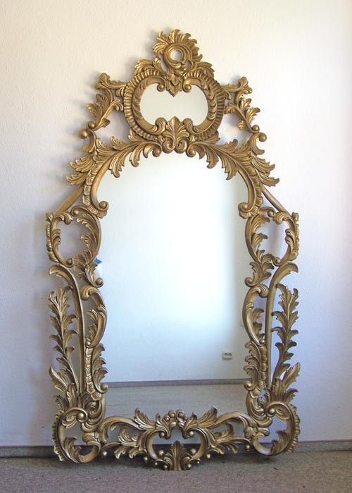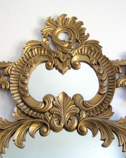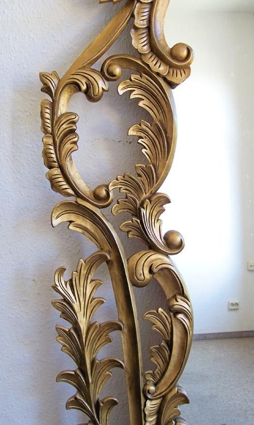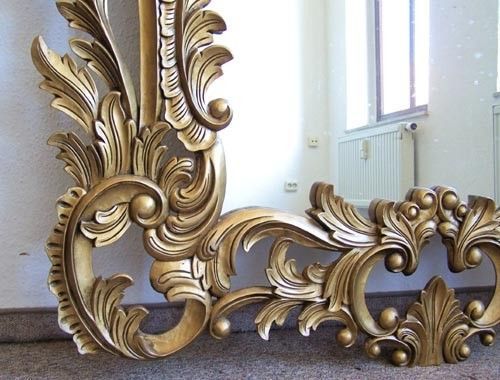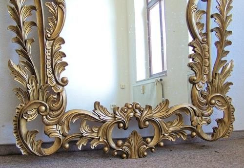 Traumhaft schöne Schnitzereien und Verzierungen, die in mühevoller Handarbeit gefertigt wurden, sowie eine sehr wirkungsvolle Formgestaltung, prägen das aussergewöhnliche Aussehen von diesen gigantischen Spiegel Der Rahmen wurde aus Mahagoni - Holz gefertigt. Der goldene Farbton hebt die detailreich