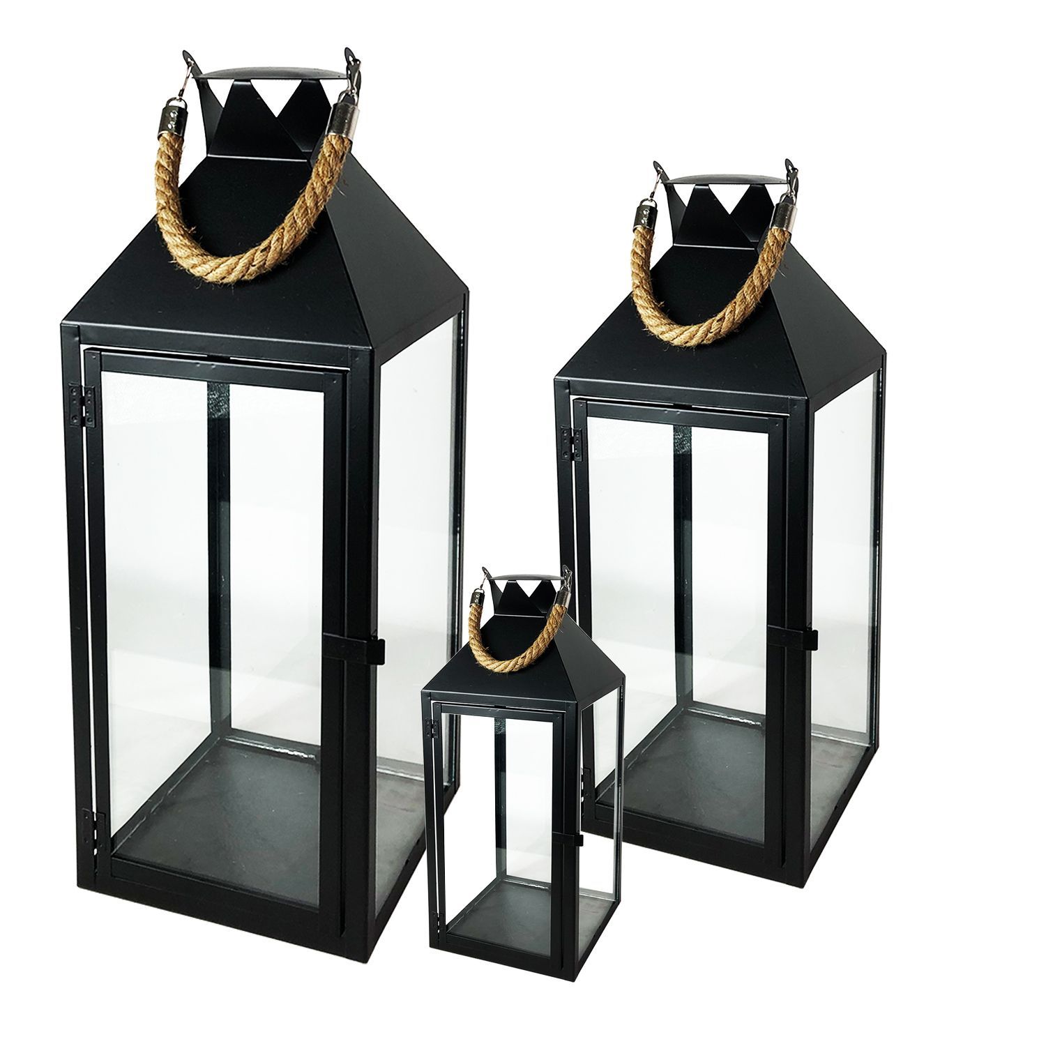 Großes 3tlg Gartenlaternen Set Windlichter 25/40/51cm mit Seilgriffen Schwarz