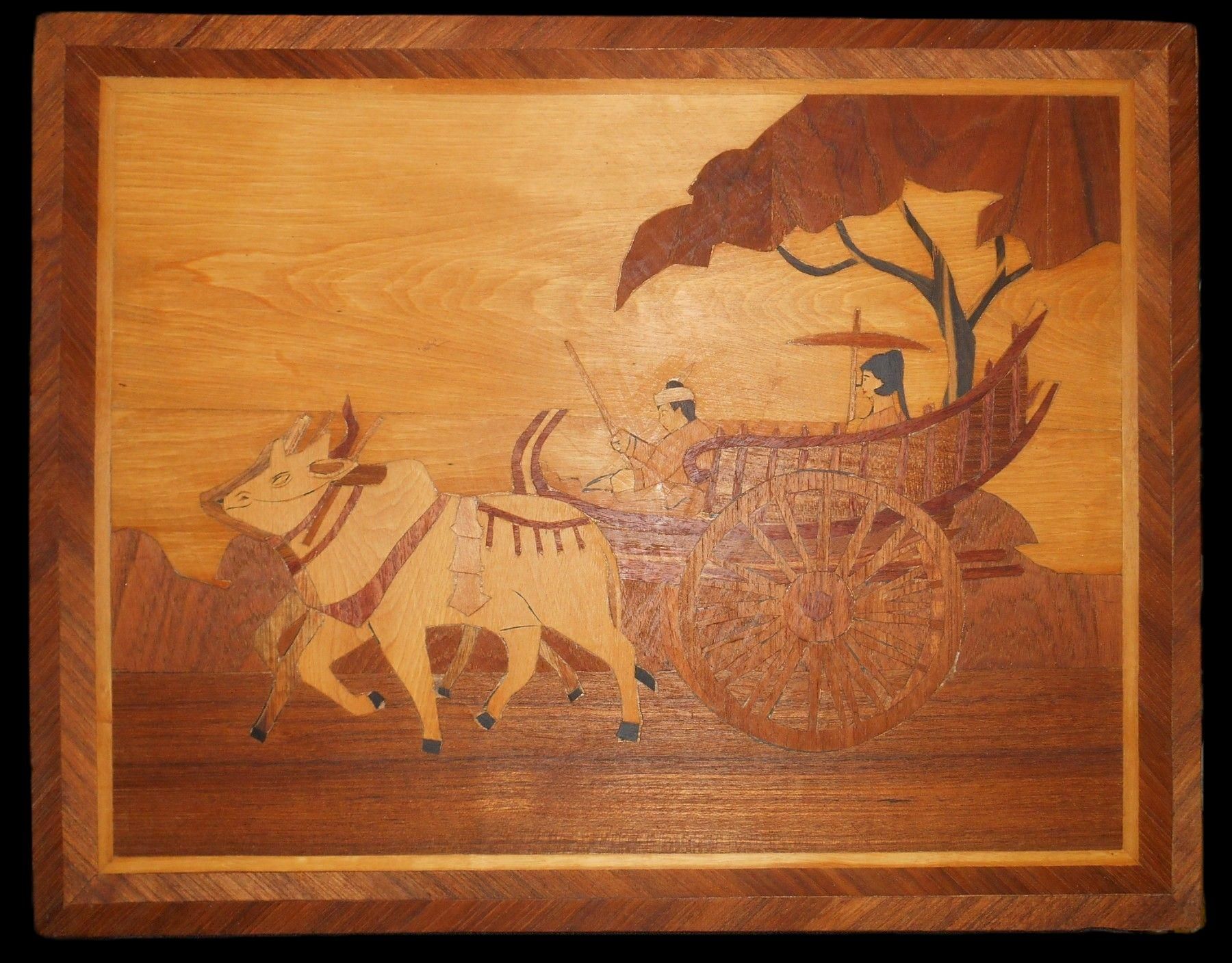 Meisterhafte Marqueterie aus kostbaren Hölzern wie Teak, Padouk, Thinwin, Magyipwe, Yamene und Binga. Das detailreiche Motiv zeigt einen traditionellen Ochsenkarren in kunstvoller Handarbeit. Die natürliche Maserung der Edelhölzer verleiht der Szene Tiefe und Eleganz. Ein hochwertiges Unikat für Sammler asiatischer Kunst.