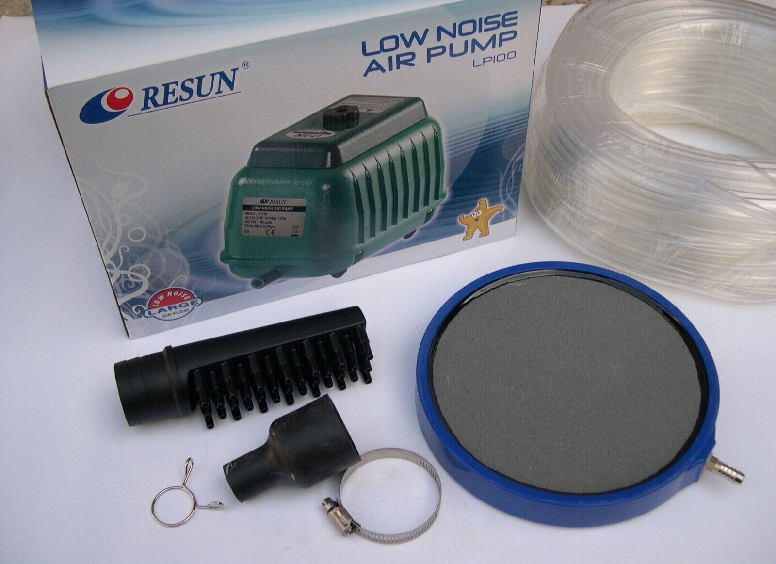 orig. verpackte NEUWARE - mit Rechnung und gesetzlicher Gewährleistung Profi Eisfreihalter-Set bzw. Teichbelüfter-Set - (siehe Foto) für Teiche bis ca. 50000 Liter und ca. 2,5m Tiefe geeignet bestehend aus : 1. Resun Membranpumpe LP 100 (sehr leise) mit einer Luftftleistung von 9000 Liter Stunde . A
