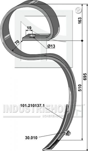 Großfederzinken mit Schar 1.1485 Großfederzinken mit Schar: Technische Datem: Bestellnr.: 1.1485 Gewicht: 8.070 kg Bohrungsabstand: 19 mm Bohrung: Ø 13 mm Gesamthöhe: 695 mm Materialabmaße: 65 x 12 weitere Angaben siehe Bild Dieser Satz enthält: 1 x 101.210137.1 Schar 1 x 30.009 Planetschraub