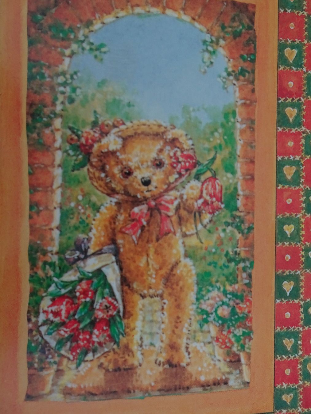 Grußkarte Teddy-Bär mit Tulpen Torbogen Strohhut neutral ohne Text