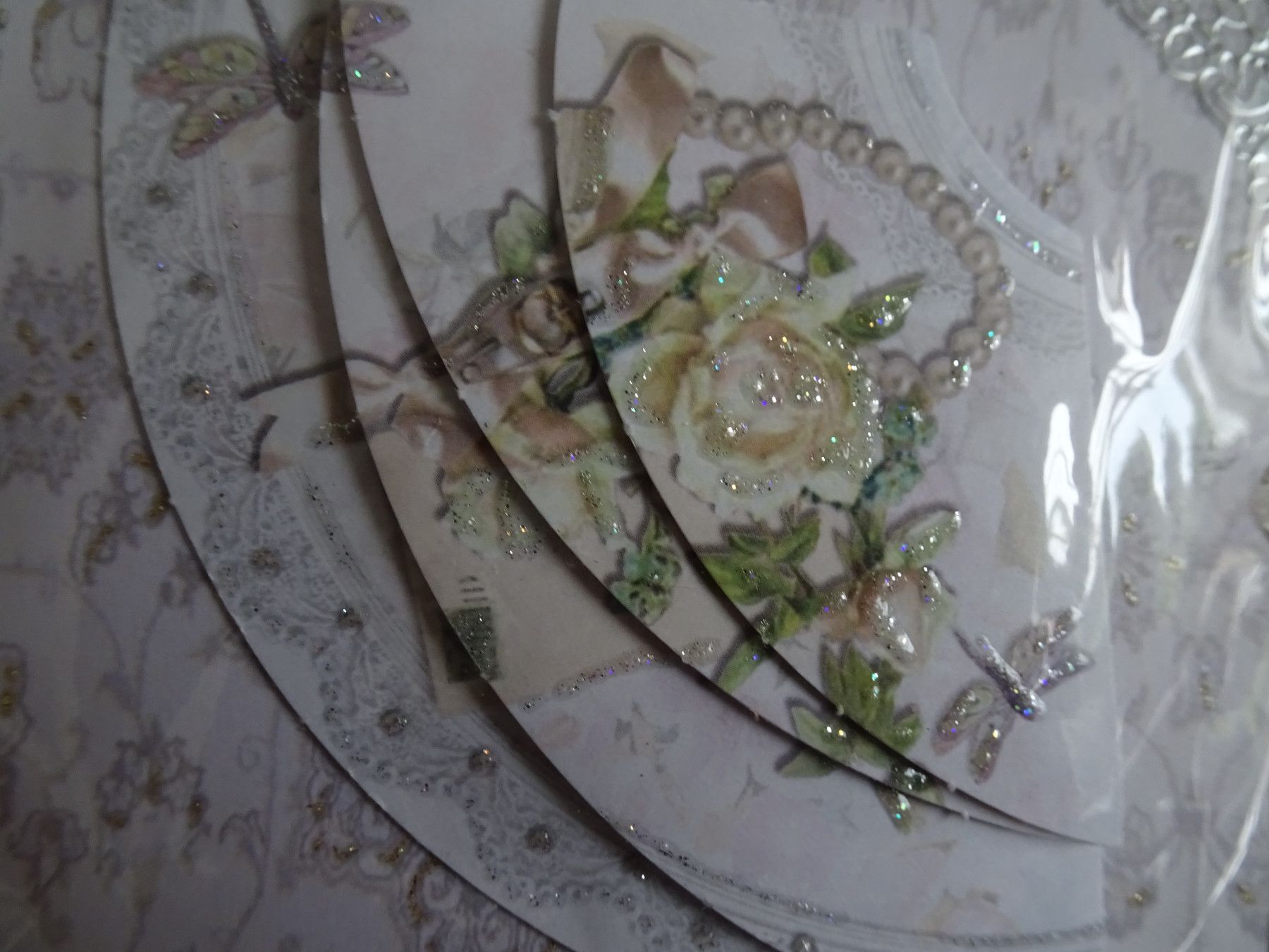 353 - "Jugendstil" Geigerin, 354 - Elfen, 355 - Schmetterlinge & Blüten, 356 - weiße Rose & Perlenkette, 357 - rote Blüten im Vintage-Kübel
