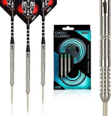 • One80 Tungsten Steeldarts mit Flights und Schäften 23 Gramm