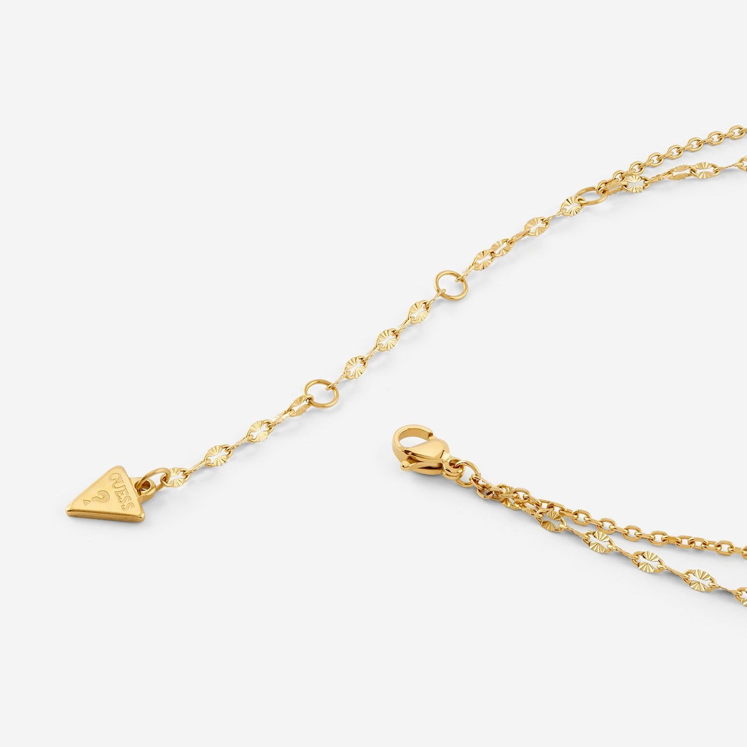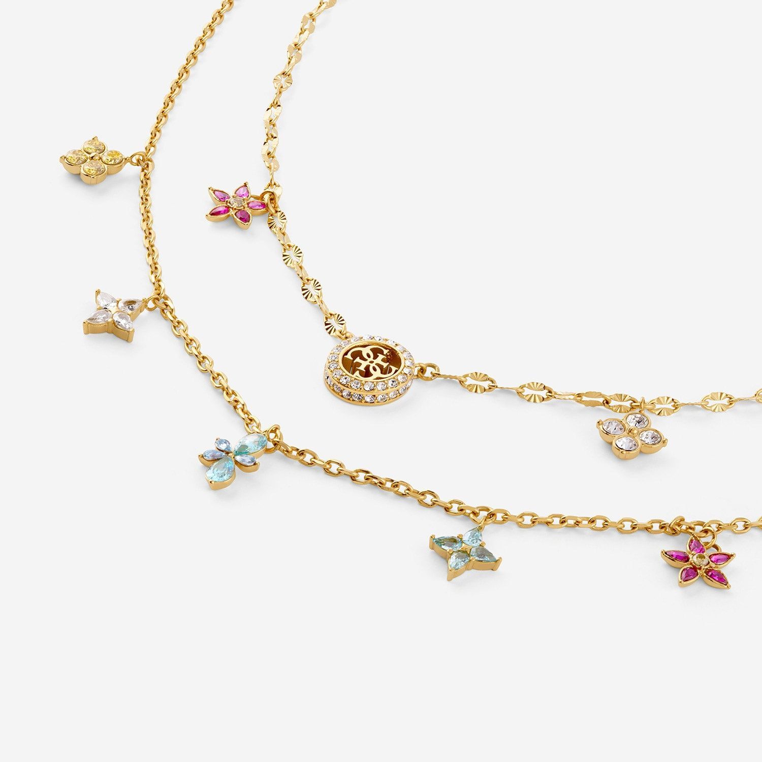 bezaubernde doppelreihige Halskette für Frauen aus der Kollektion Secret Garden, aus poliertem Edelstahl, gold ionen-plattiert, Ankerkette, Stärke 1,5 mm, längere Fantasiekettengliederung, Stärke 2 mm, Länge 40 cm (+ 8 cm Verlängerungskette mit Logoplättchen), verschiedenartige Blütenanhänger besetzt mit funkelnden Kristallen in unterschiedlichen Farben, 4G-Anhänger, Rand besetzt mit funkelnden Kristallen, Durchmesser 10 mm, sicherer Karabiner-Verschluss