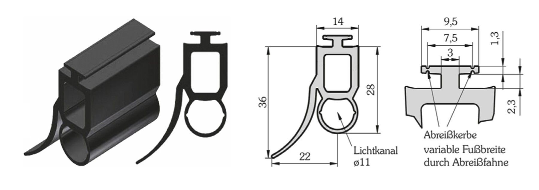 Gummiprofil für Opto-Sensoren, mit Dichtlippe, für 55/77mm Profil mit T Nut 3m