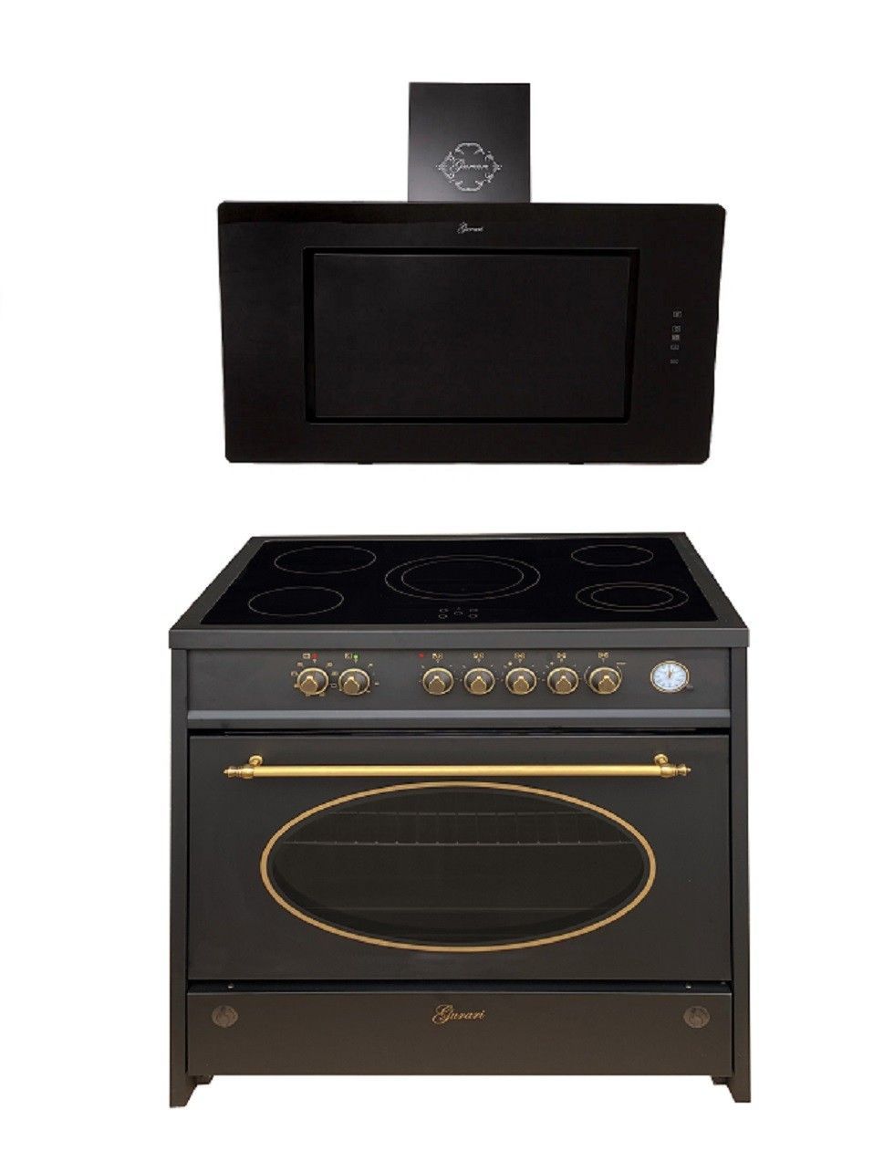 GURARI GCH E 912 BL r Elektro Standherd 90 cm, Retro , Creme, Range Coocker+GURARI Kopffreihaube GCH S 155 BL 90 Prime Luxus Dunstabzugshaube 90 cm, Schwarz Glas