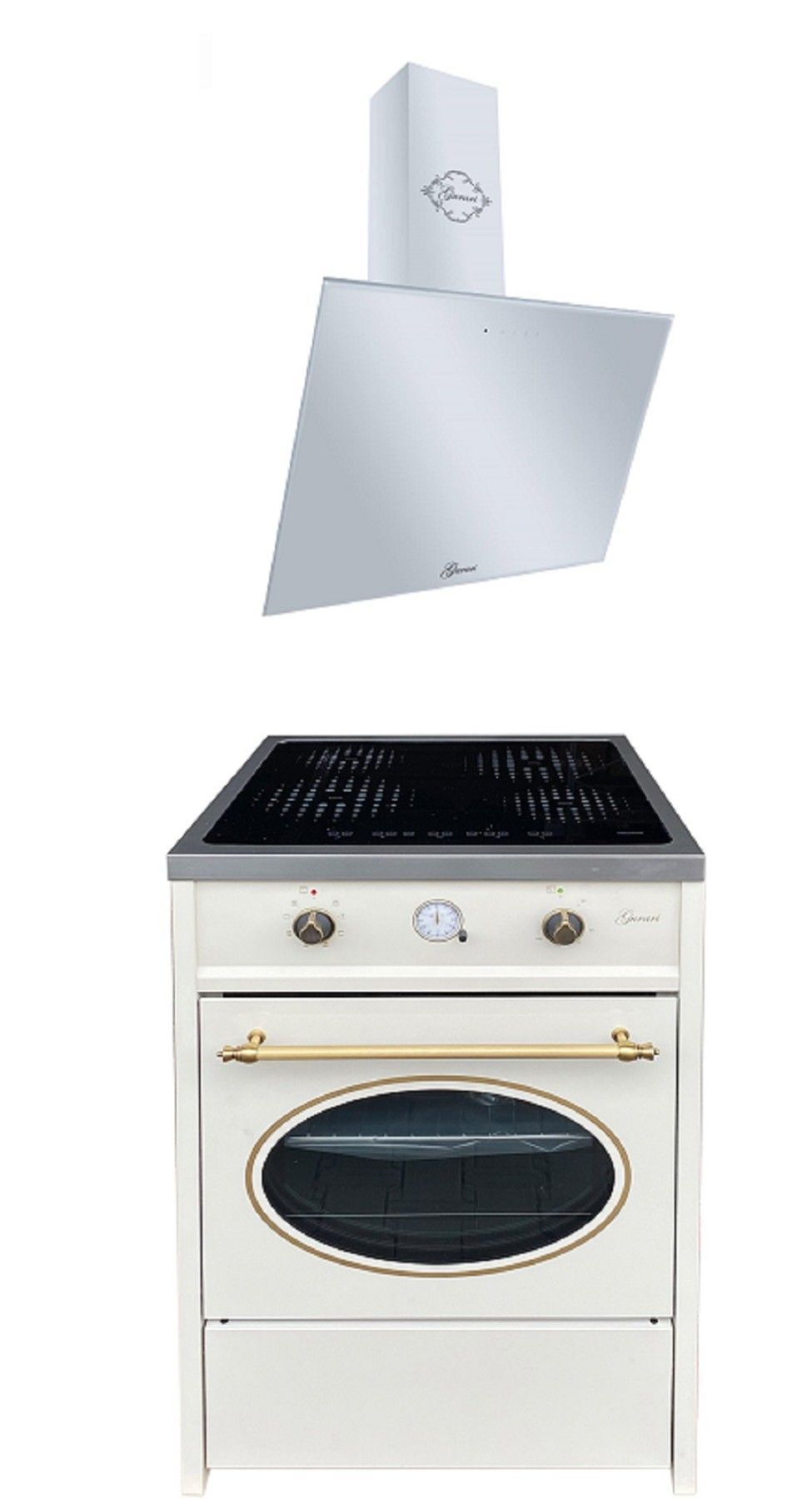 GURARI Induktions-Standherd GCH E 612 Cr r +GCH C 046.WH 9, Retro Induktions Standherd 60 cm/ Range Coocker / 60 L /Creme/ 8 Funktionen / Heißluft/ Grill/ 4 Kochzonen/ 4x Booster/Teleskopauszug+kopffreie Dunstabzugshaube 80cm in Weiß/ 1000m³/h / Wandhaube / Weiß Glas/ TouchControl/Fernbedienung/Timer/Randabsaugung/ Timer/