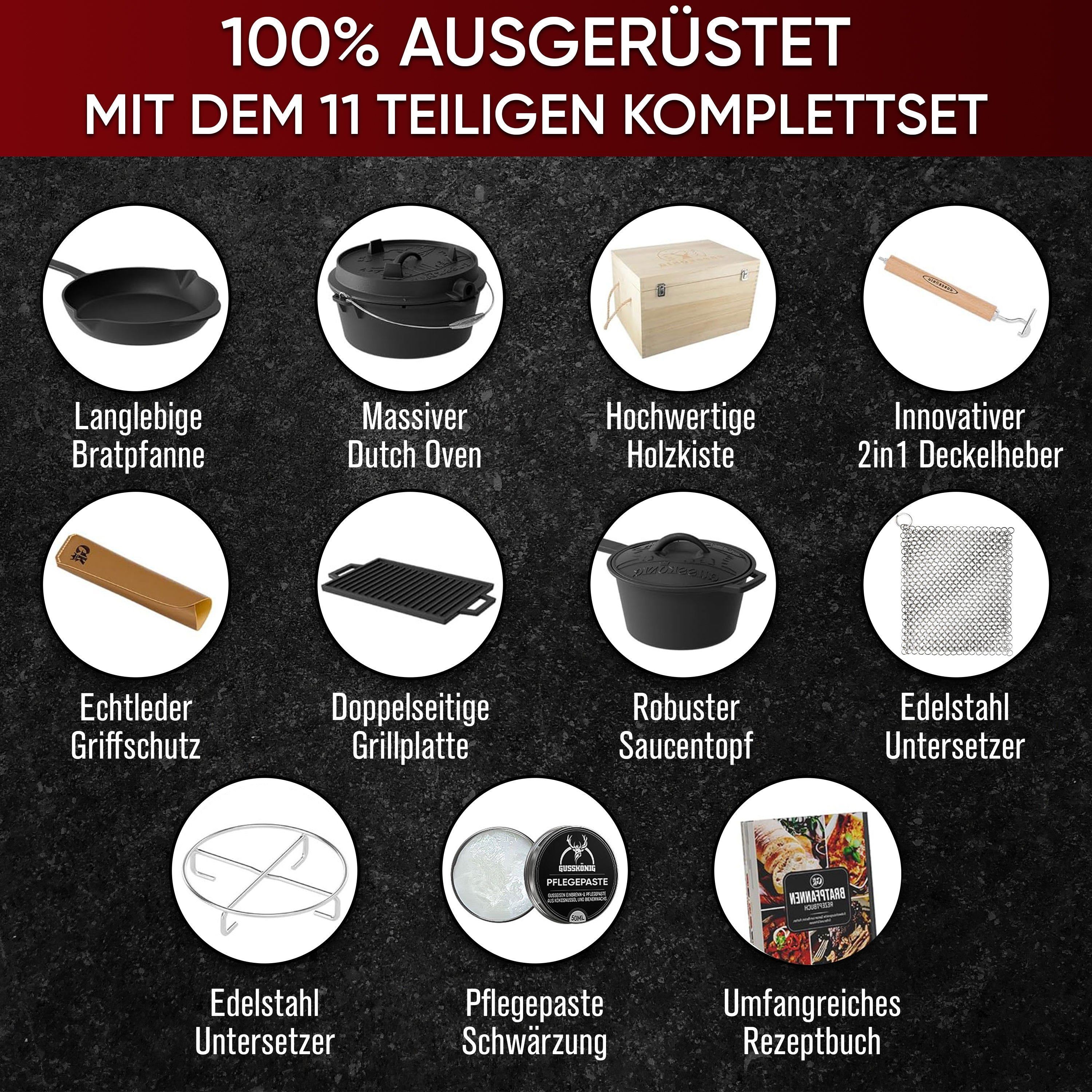 Gusskönig Dutch Oven in Holzbox 11tlg. mit Bratpfanne Saucentopf Untersetzer Deckelhe