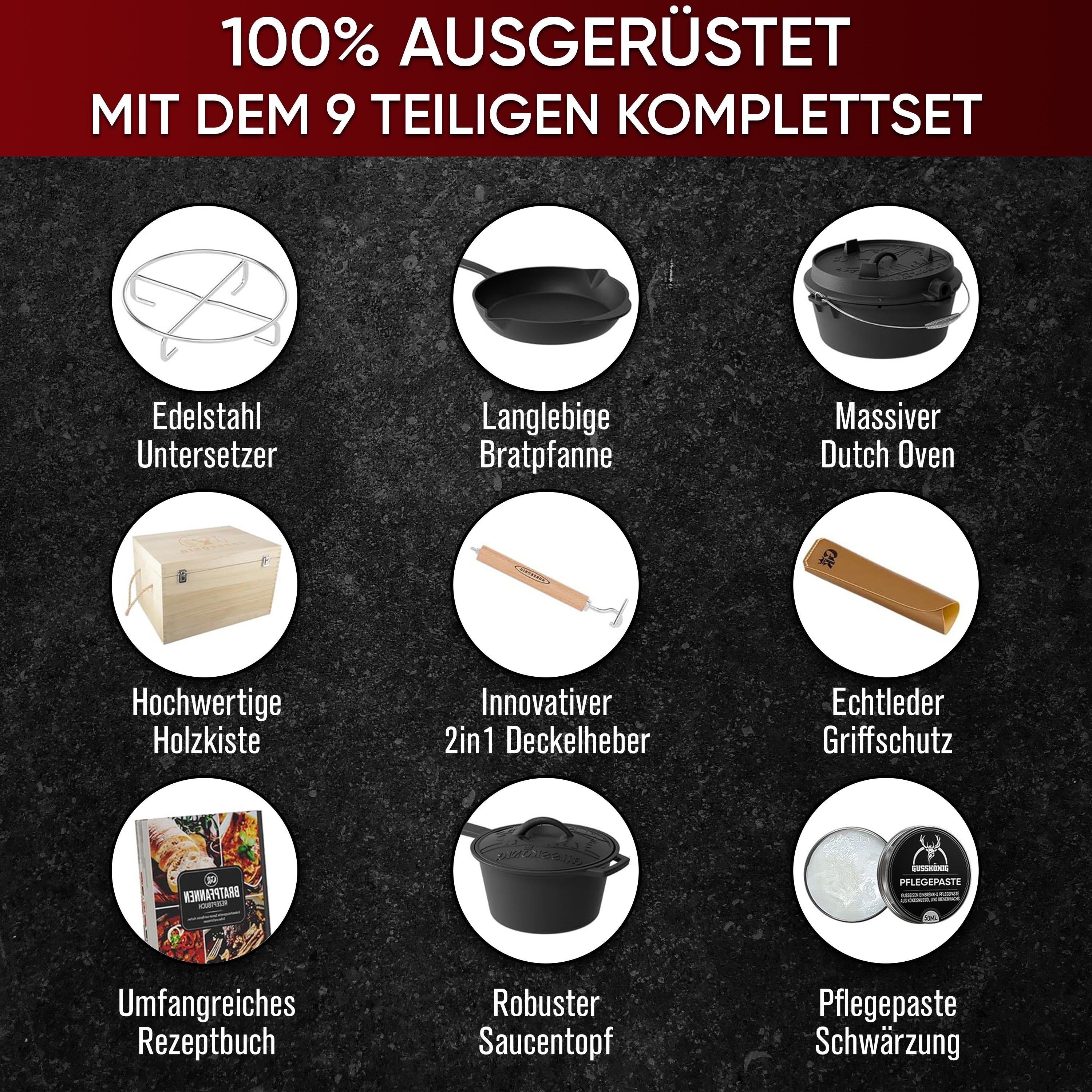 Gusskönig Dutch Oven in Holzbox 9tlg. mit Bratpfanne Saucentopf Untersetzer Deckelheb