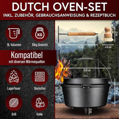 Gusskönig Dutch Oven Set 12 Liter Feuertopf Gusseisen inkl. 2in1 Deckelheber Rezeptbu