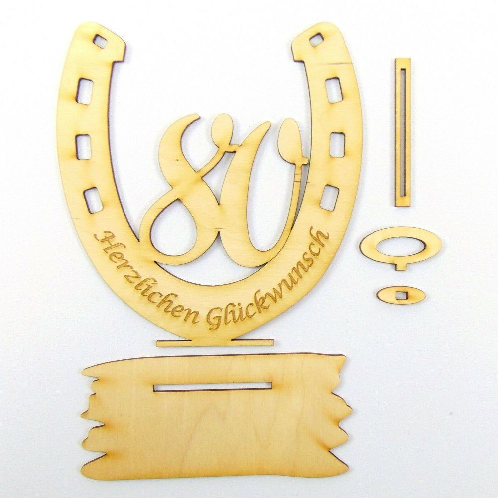 Gutschein 80 Geburtstag, Geldgeschenk, Hufeisen 15 cm aus Holz mit Glückwunsch