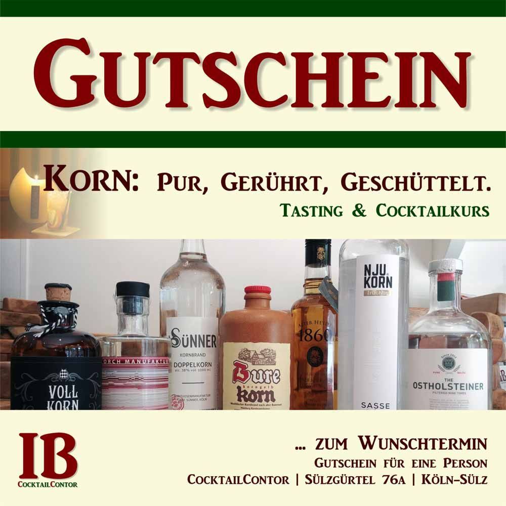 Gutschein: Korn: Pur, gerührt, geschüttelt. Korn-Tasting & Cocktailkurs in Köln. Um dich mit der vielfältigen Welt des Korns vertraut zu machen, kombinieren wir ein Korn-Tasting mit einem Korn-Cocktailkurs.