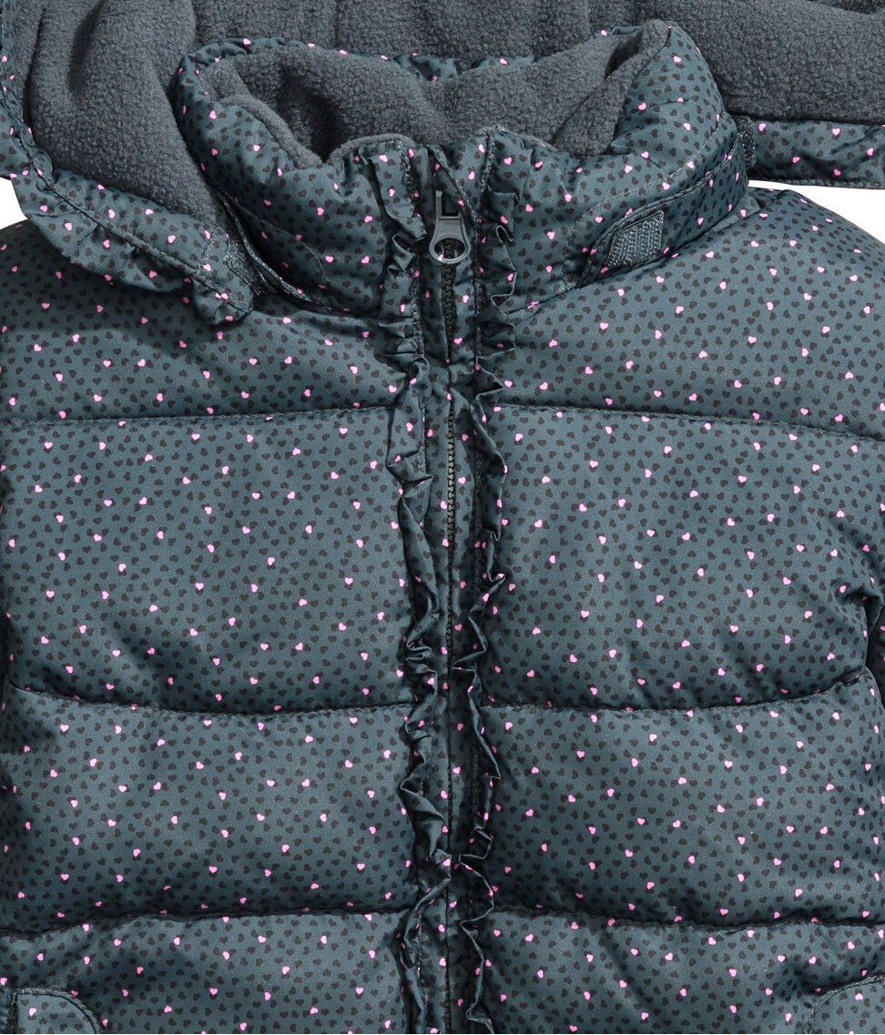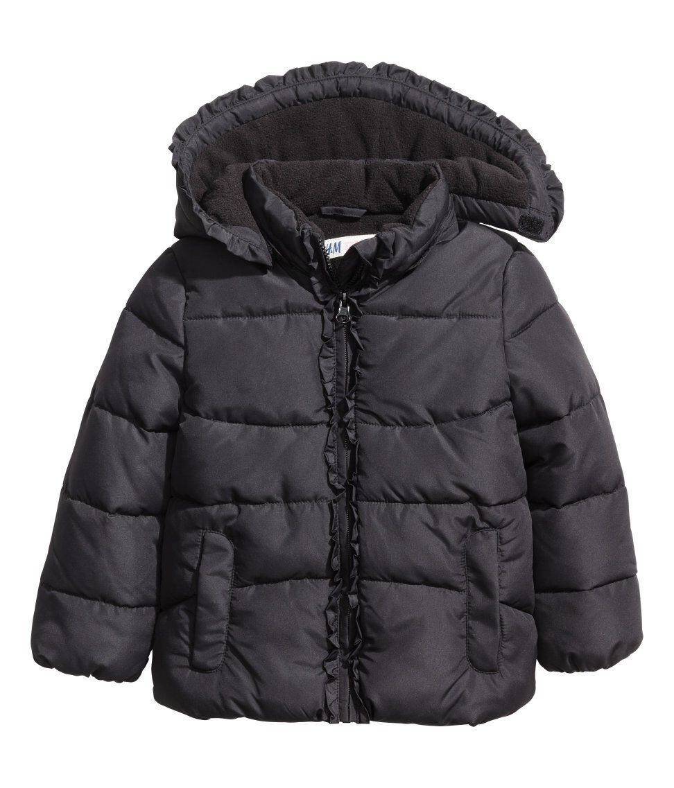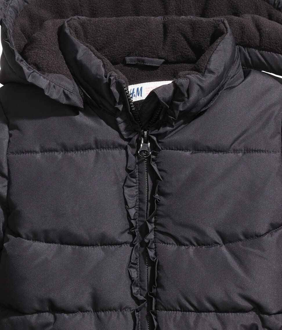 H&M Wattierte Jacke -abnehmbare, fleecegefütterte Kapuze. Die Jacke einen Volant am Kapuzenrand und vorn entlang des Reißverschlusses. -Seitliche Taschen -elastische Ärmelabschlüsse. Vorderseite und Rückenteil sind mit Fleece gefüttert, die Ärmel mit Satin. Gr. 116, 122, 128 Obermaterial: 100%Po
