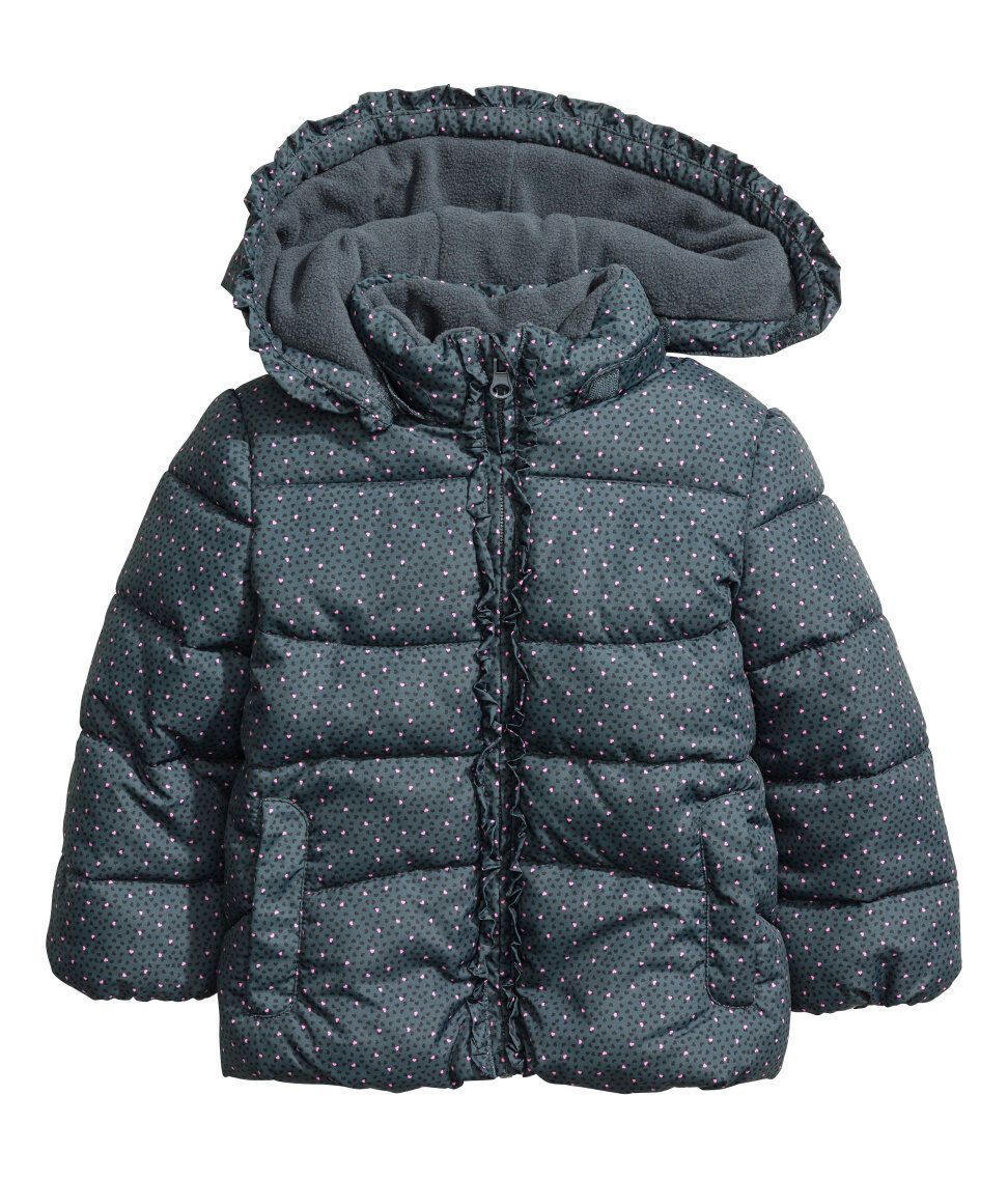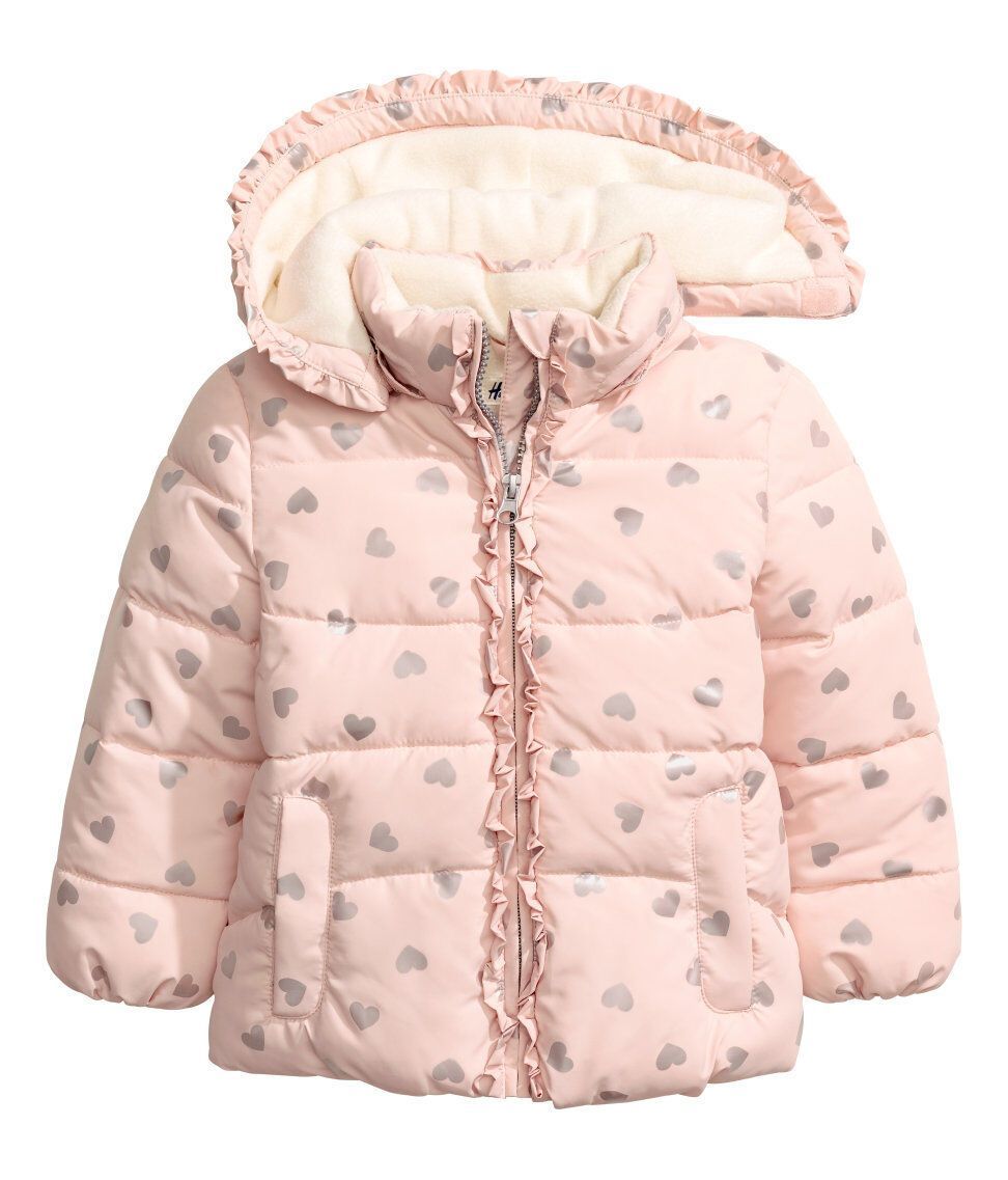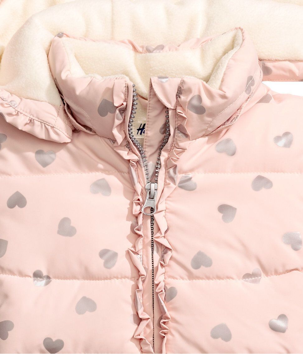 H&M Wattierte Jacke -abnehmbare, fleecegefütterte Kapuze. Die Jacke einen Volant am Kapuzenrand und vorn entlang des Reißverschlusses. -Seitliche Taschen -elastische Ärmelabschlüsse. Vorderseite und Rückenteil sind mit Fleece gefüttert, die Ärmel mit Satin. Gr. 116, 122, 128 Obermaterial: 100%Po