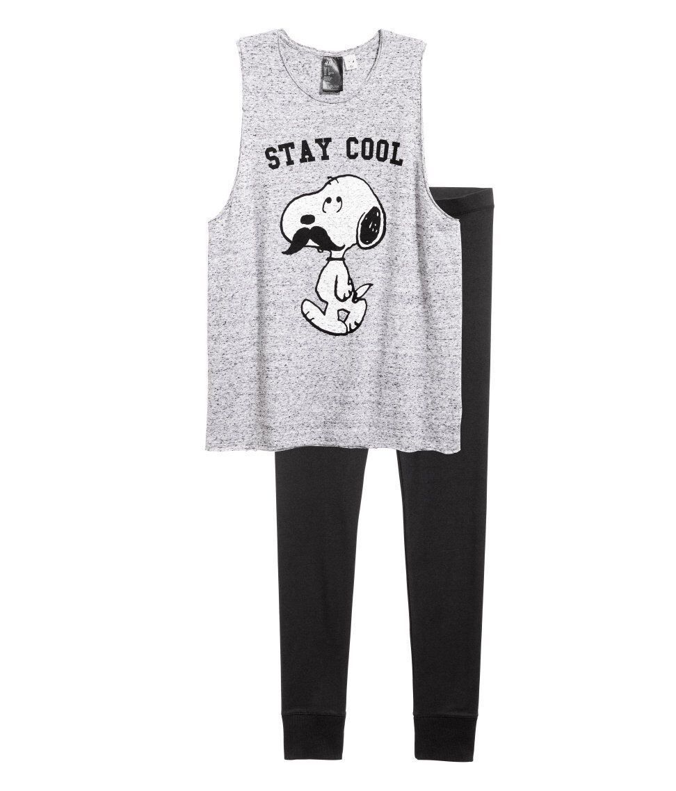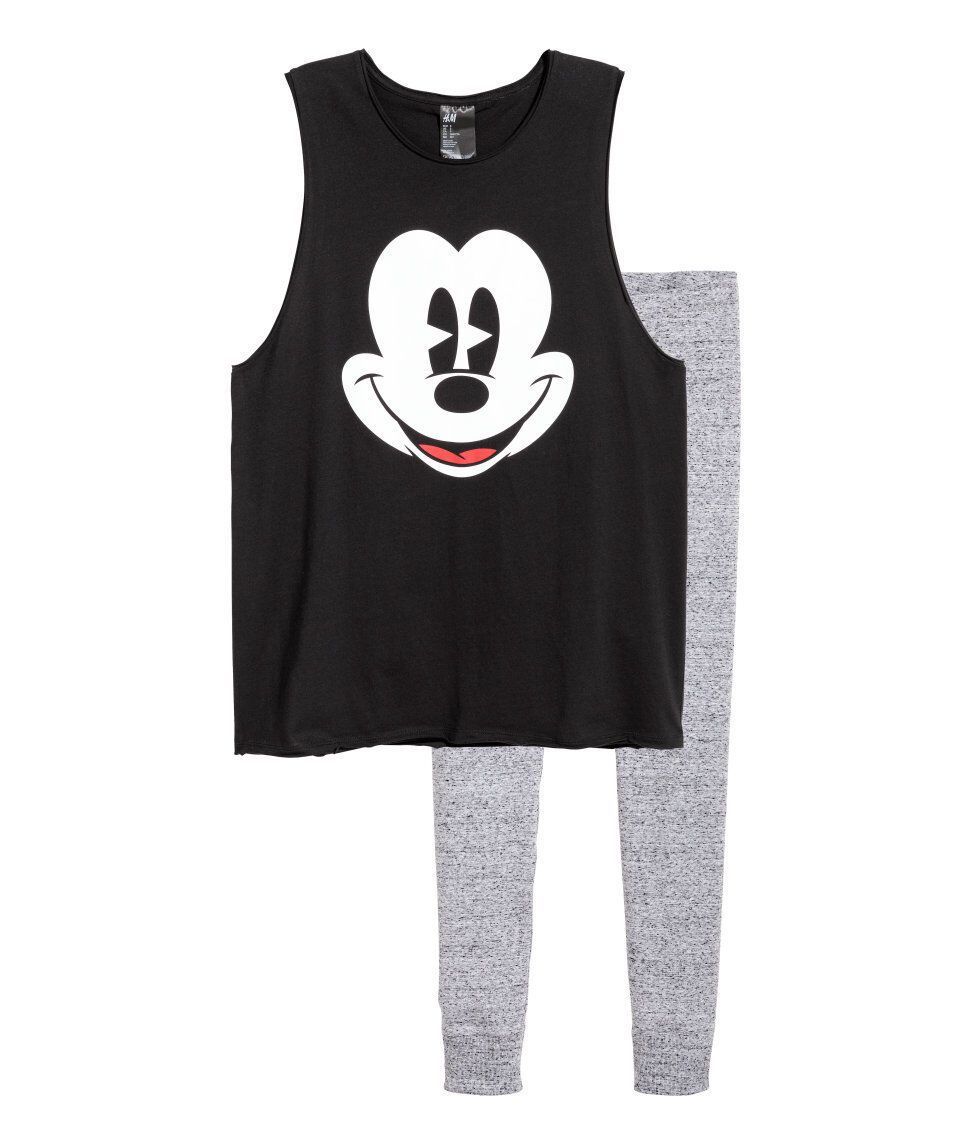 H&M Schlafanzug Pyjama Schlafshirt & Leggings Gr . XS, S, M, L Schlafanzug mit Oversize-Top und Leggings. Das Top hat einen Frontdruck, offene Kanten und tiefe Armöffnungen. Leggings mit elastischem Bund. Farbe: schwarz Micky Maus oder grau Snoopy Material Snoopy Shirt :58% Baumwolle,42%Poly