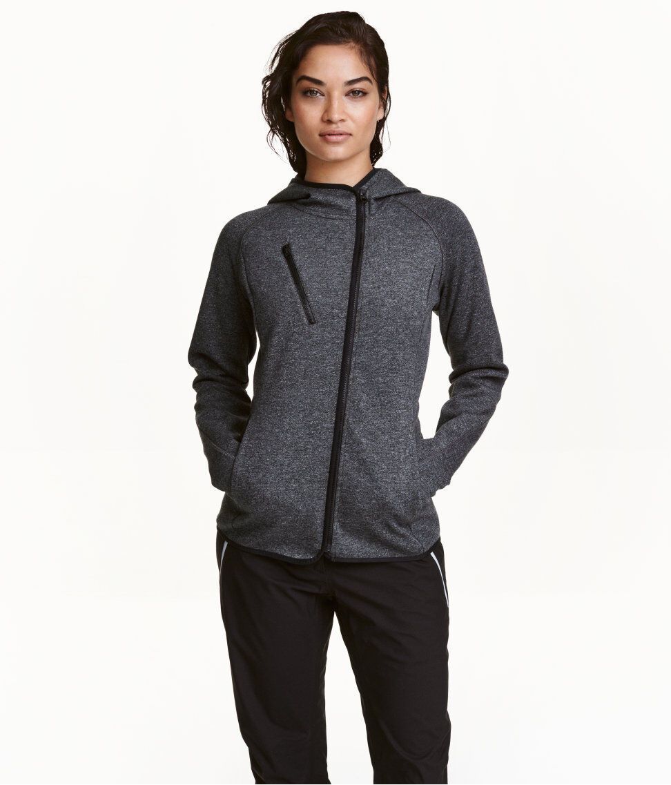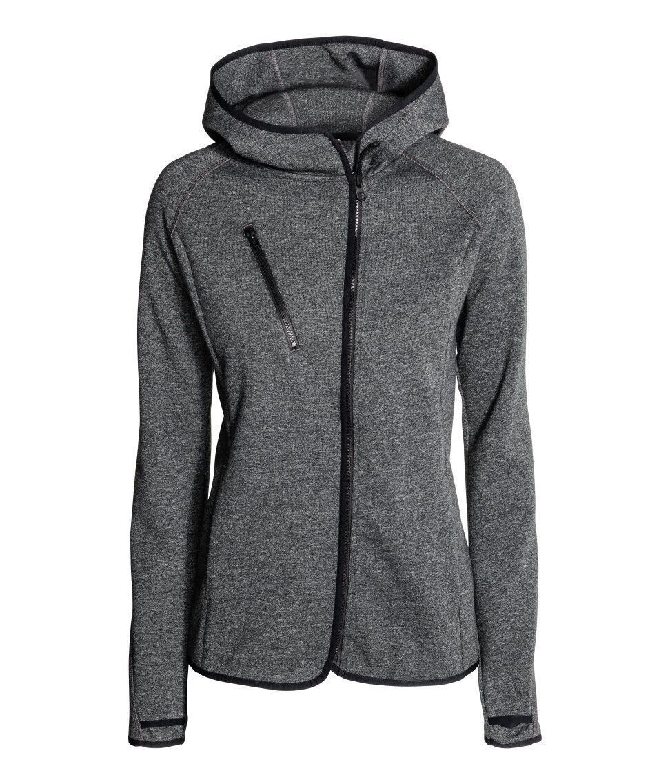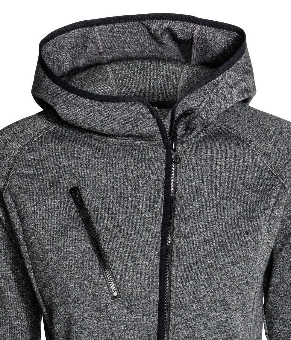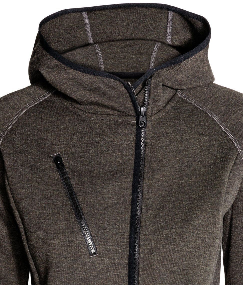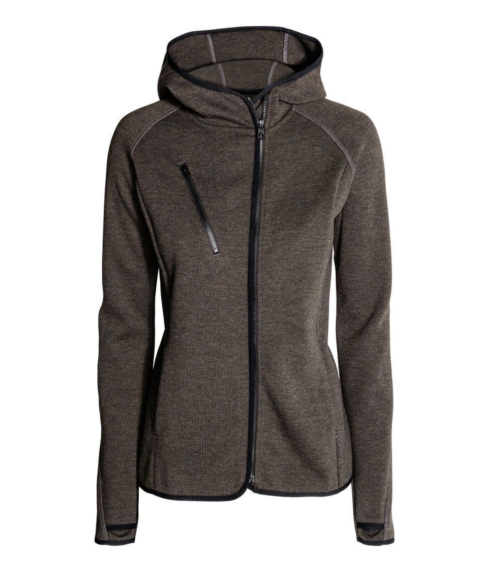 H&M Sport Outdoor Outdoorjacke Gr. S, M, L Outdoorjacke aus festem, meliertem Jersey. Modell mit gefütterter Kapuze und schrägem Reißverschluss vorn. Schräge Brusttasche mit Zipper und seitliche Nahttaschen. Lange Raglanärmel mit Daumenloch. Obermaterial: 73% Polyester, 27% Baumwolle Farbe: khak