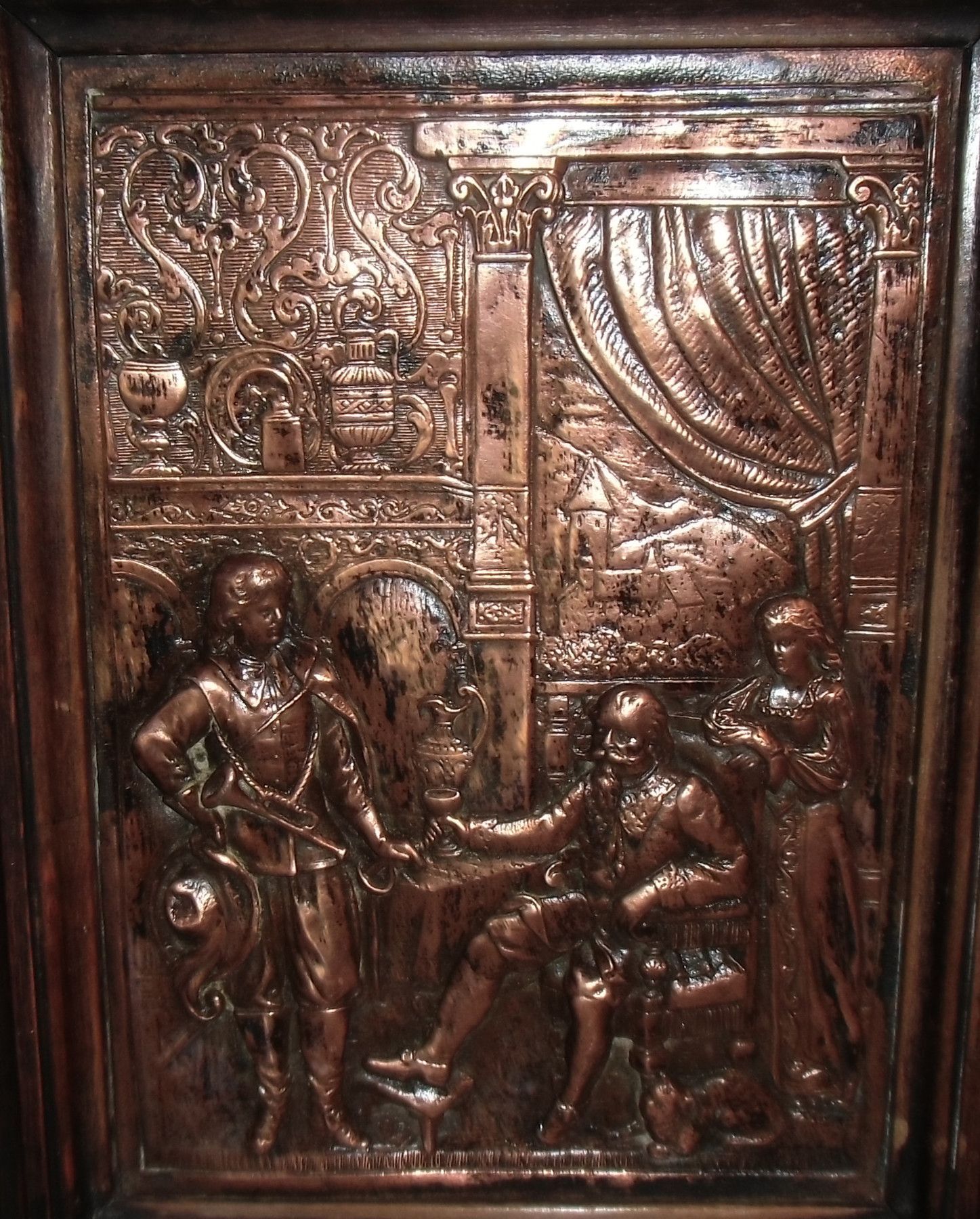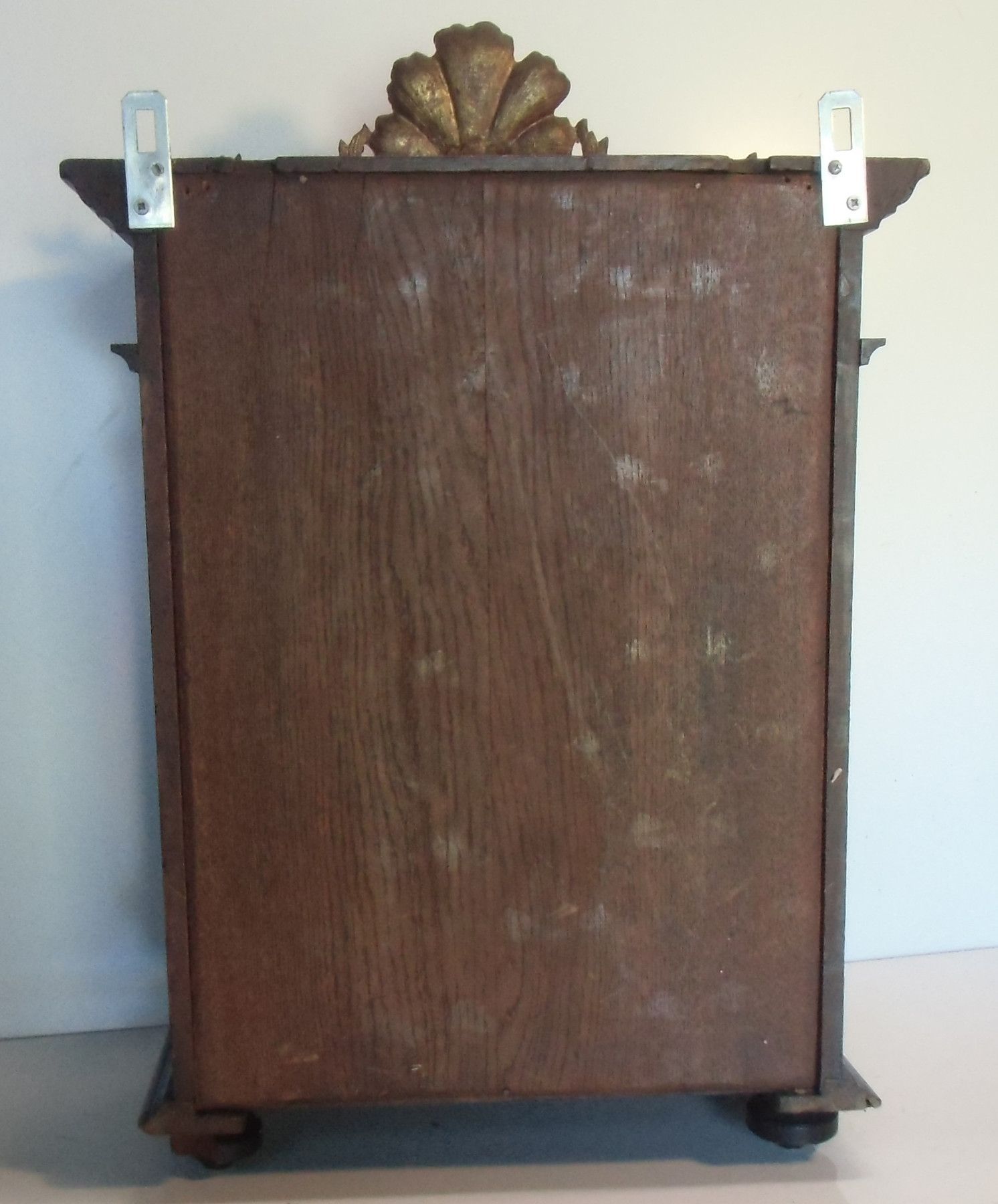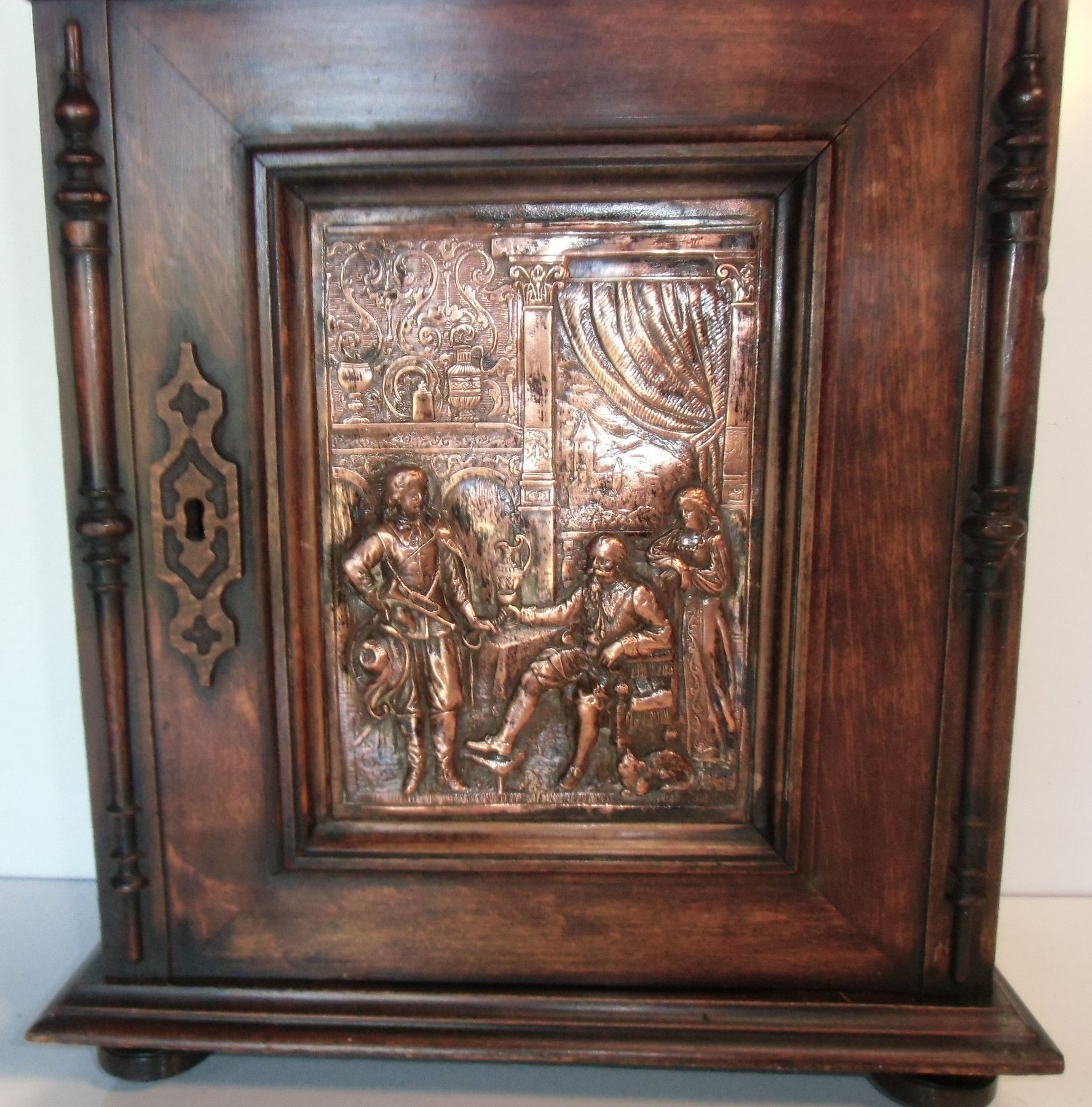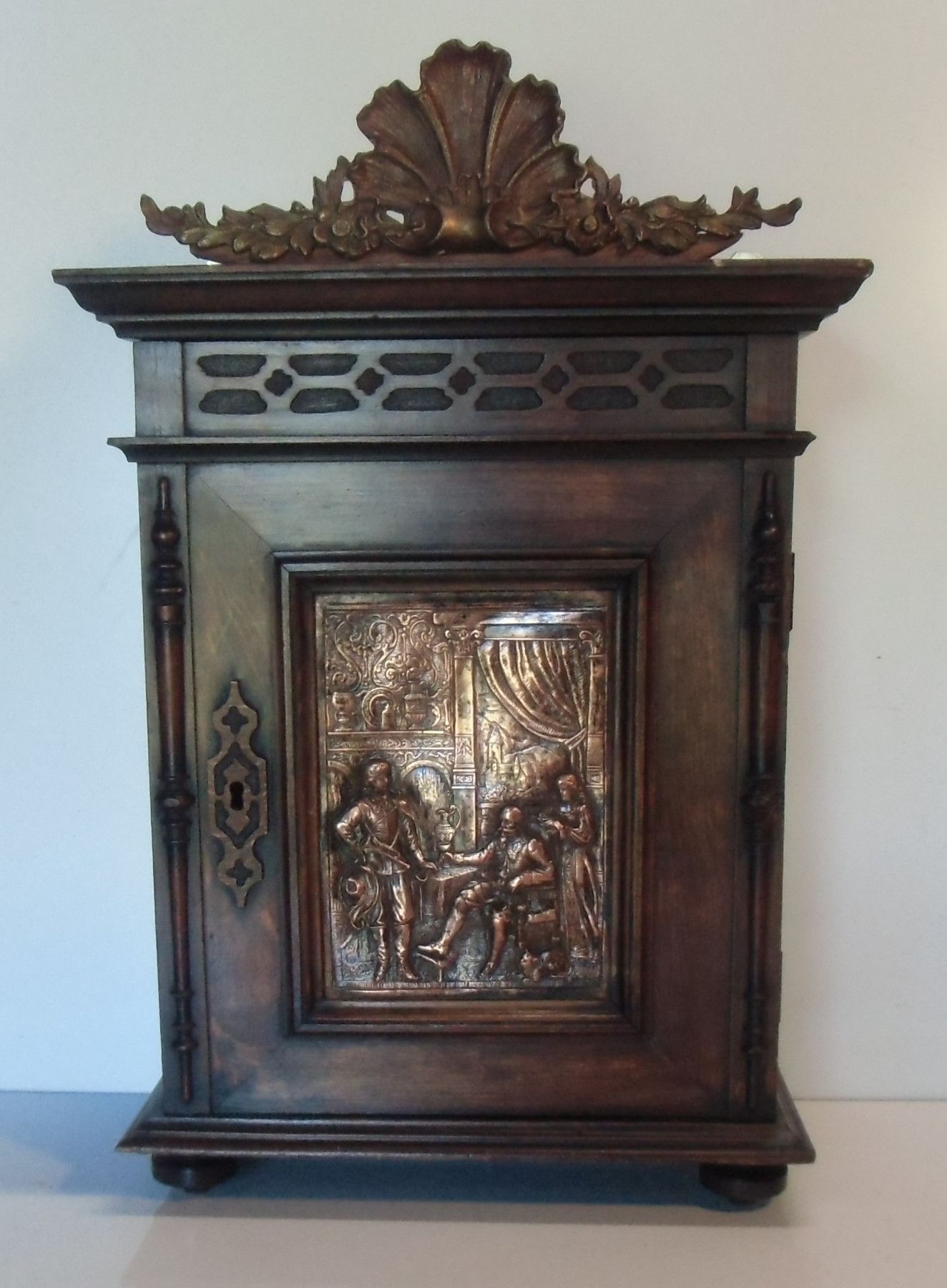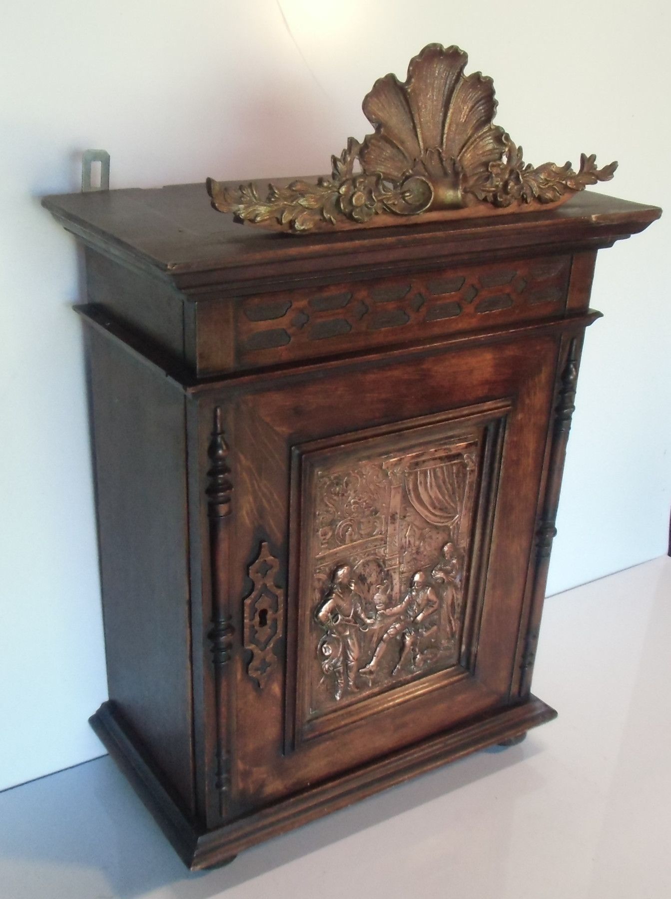 Hänge-Schrank um 1880 (Historismus) Nicht zerlegbar. Material: massive Eiche mittel. Die Türfüllung bildet ein Kupferbild. Das Schloss fehlt, ist aber leicht nachzurüsten. Hinter der Tür befinden sich 2 Ablagen. Zwei Ösen sichern das Möbel an der Wand. Sehr guter Zustand! Maße: H 60, B 37, T 22, Inn