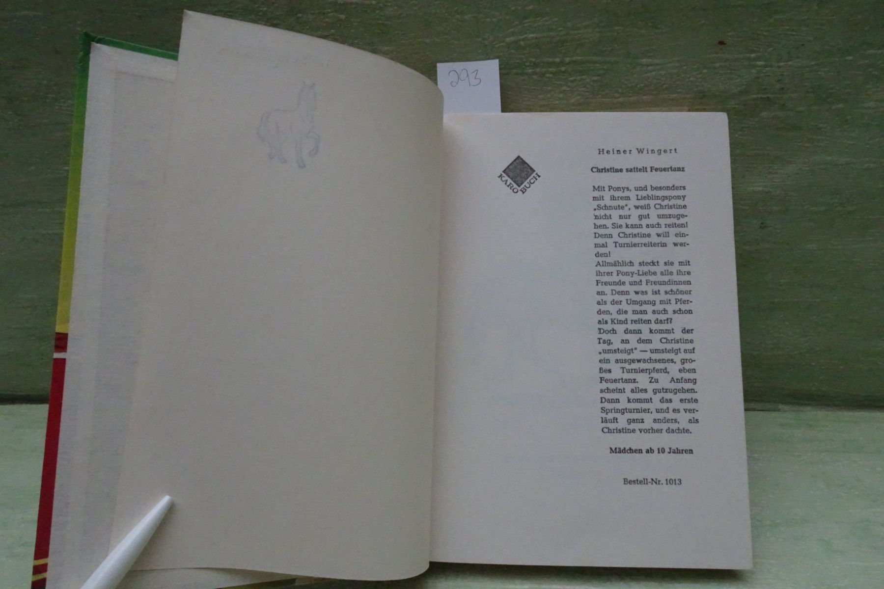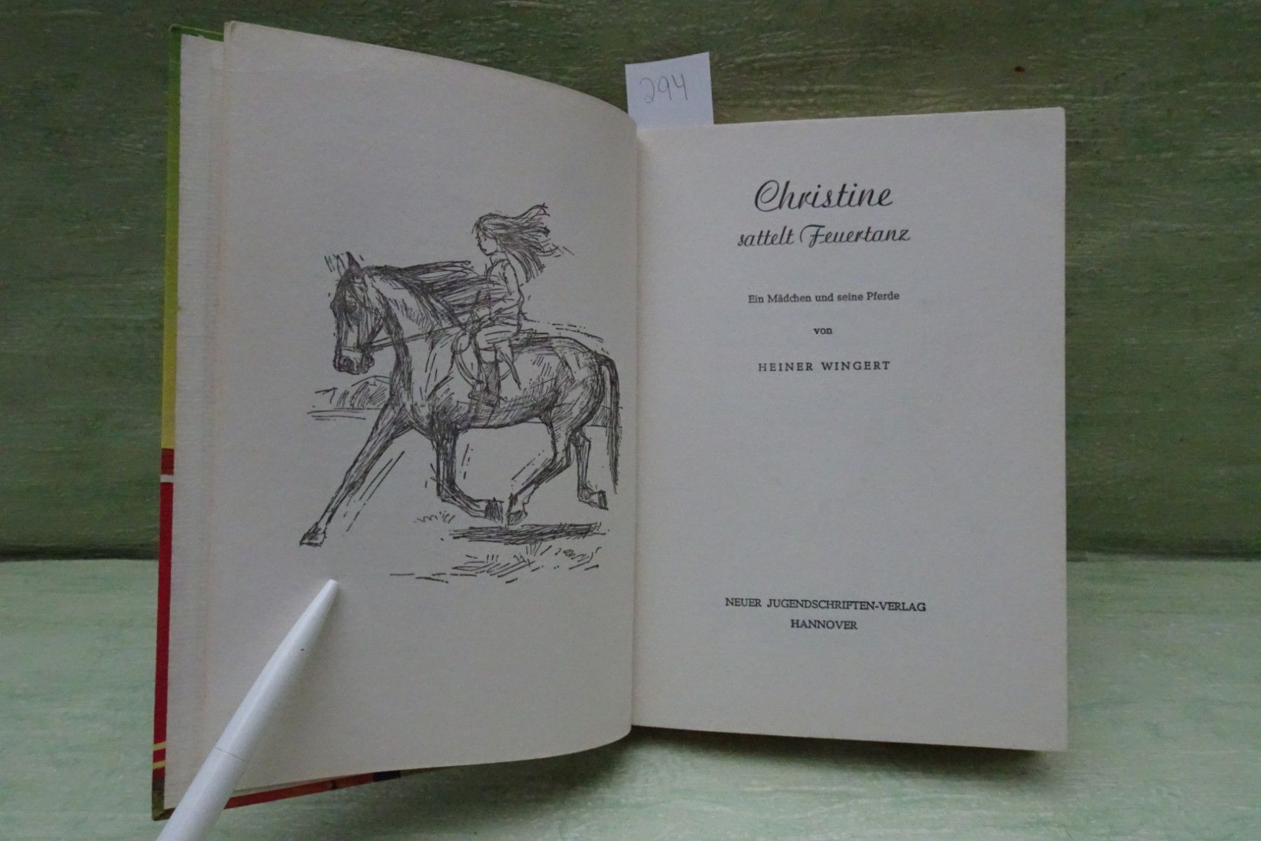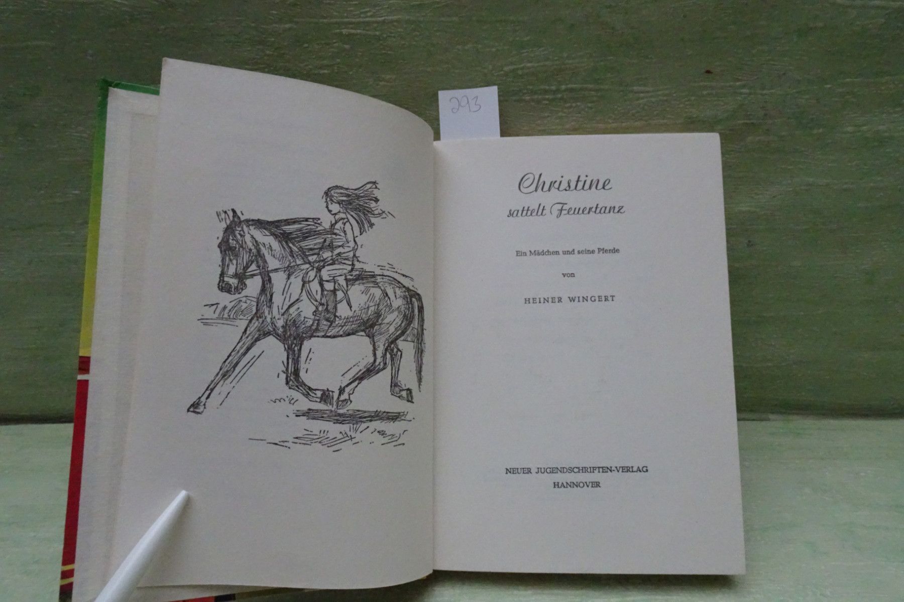 Jugend- & Kinderbücher ... Erinnerungen ..... Heiner Wingert Christine sattelt Feuertanz Textzeichnungen Ursula Dönges-Sandler -Auswahl- Abkürzungen: Buchschnitt : BS fleckig Buchecken : BE bestoßen Buchrücken : BR defekt Seiten : S Fadenbindung : FB Farbkopfschnitt : FK Frakturschrift : FS Hard