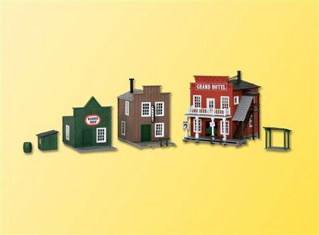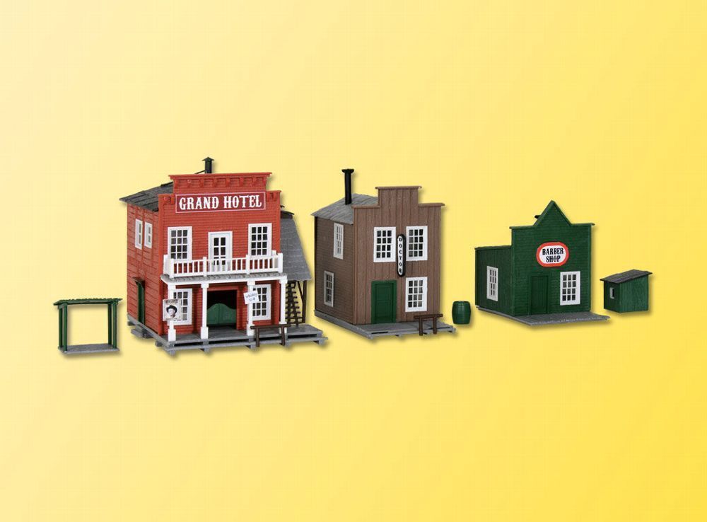 H0 Westernhäuser Ensemble Hotels Artikel Nr. 38501 Bausatz. Nostalgieserie der Wilde Westen. Drei Hotelgebäude, passend zu den Cowboys aus der Serie eMotion von Viessmann. Maße: 11 x 9,5 x 10 cm, 9,5 x 6 x 8,5 cm, 7,5 x 6 x 7,5 cm. Schwierigkeitsgrad: 2 (Fortgeschrittene) Gestaltungsbeispiel Bausatz