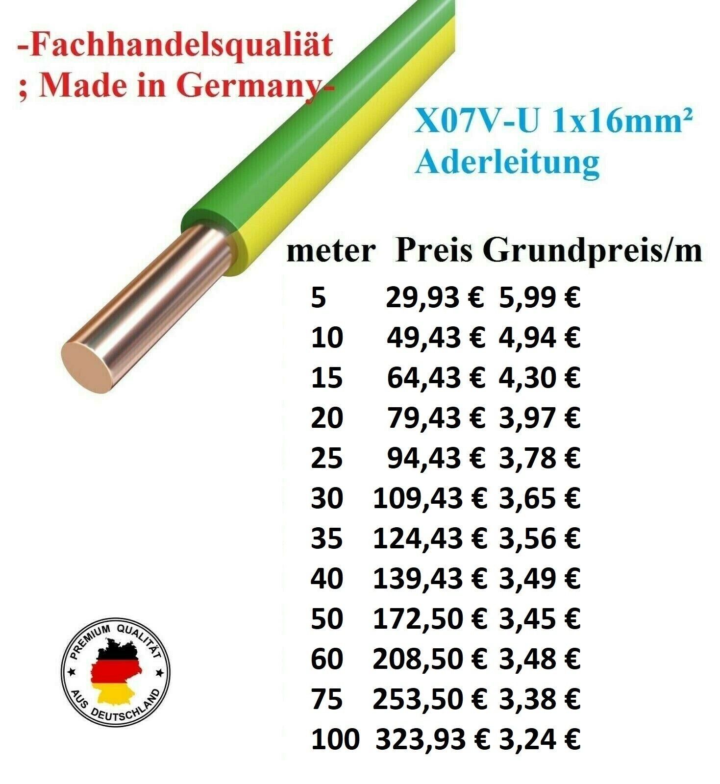 H07V-U 16 mmq Aderleitung Erdungskabel starr grün / gelb - Fachhandelsqualität