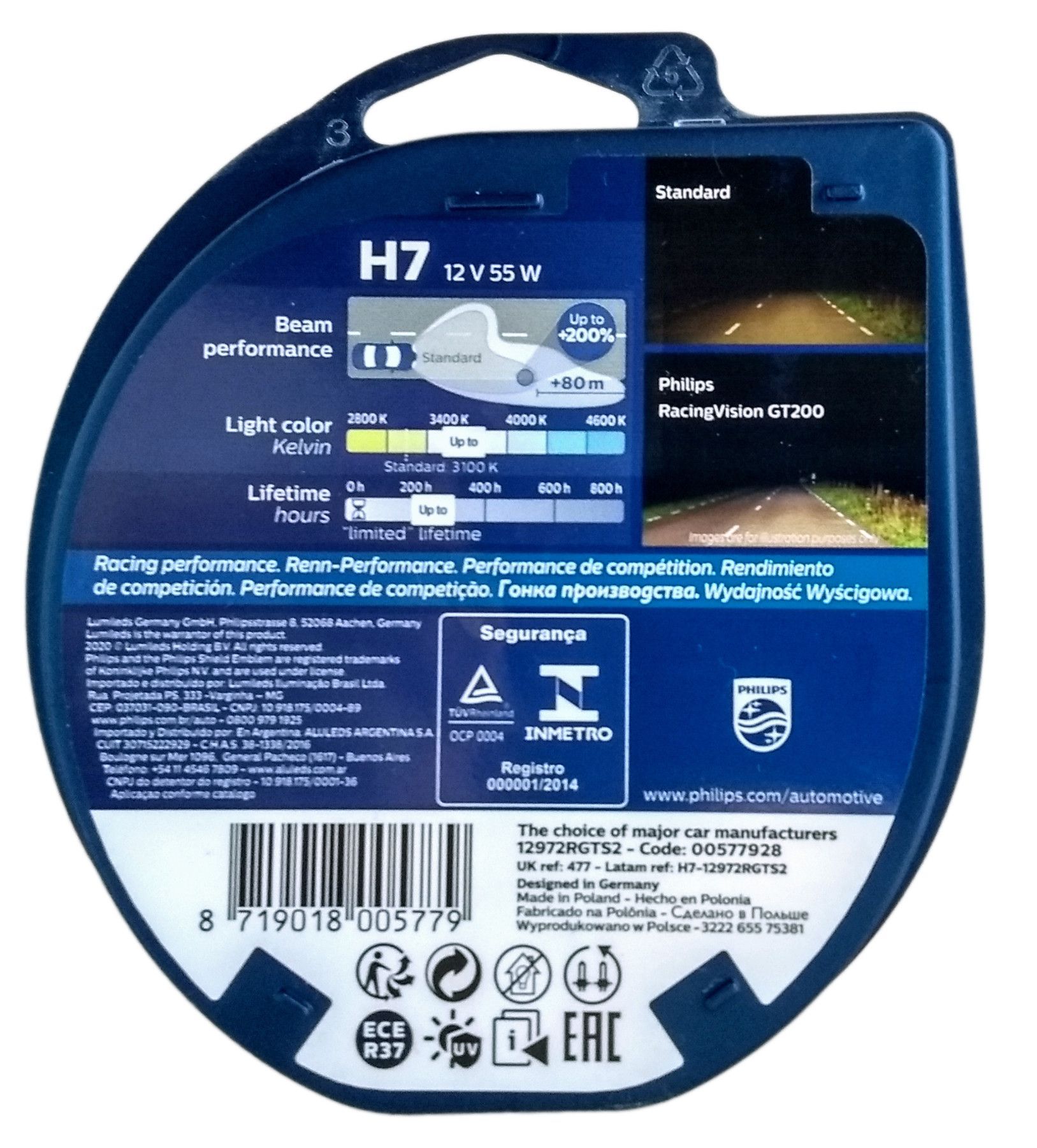Philips H7 Philips RacingVision GT200 Halogen 12V 60/55W + 200% 2st. PX26d 12972RGTS2