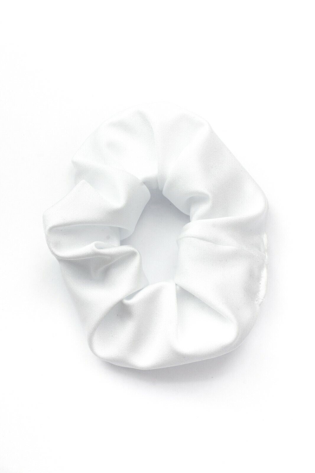 Elastisches, breiter Haargummi "Scrunchie", aus 80% Polyamid 20% Elasthan. Farbe: Weiß, glänzend Stoffbreite ca. 4,5cm Außendurchmesser ca. 11cm Innendurchmesser ca. 4cm Waschbar bei 30°C Maschinenwäsche